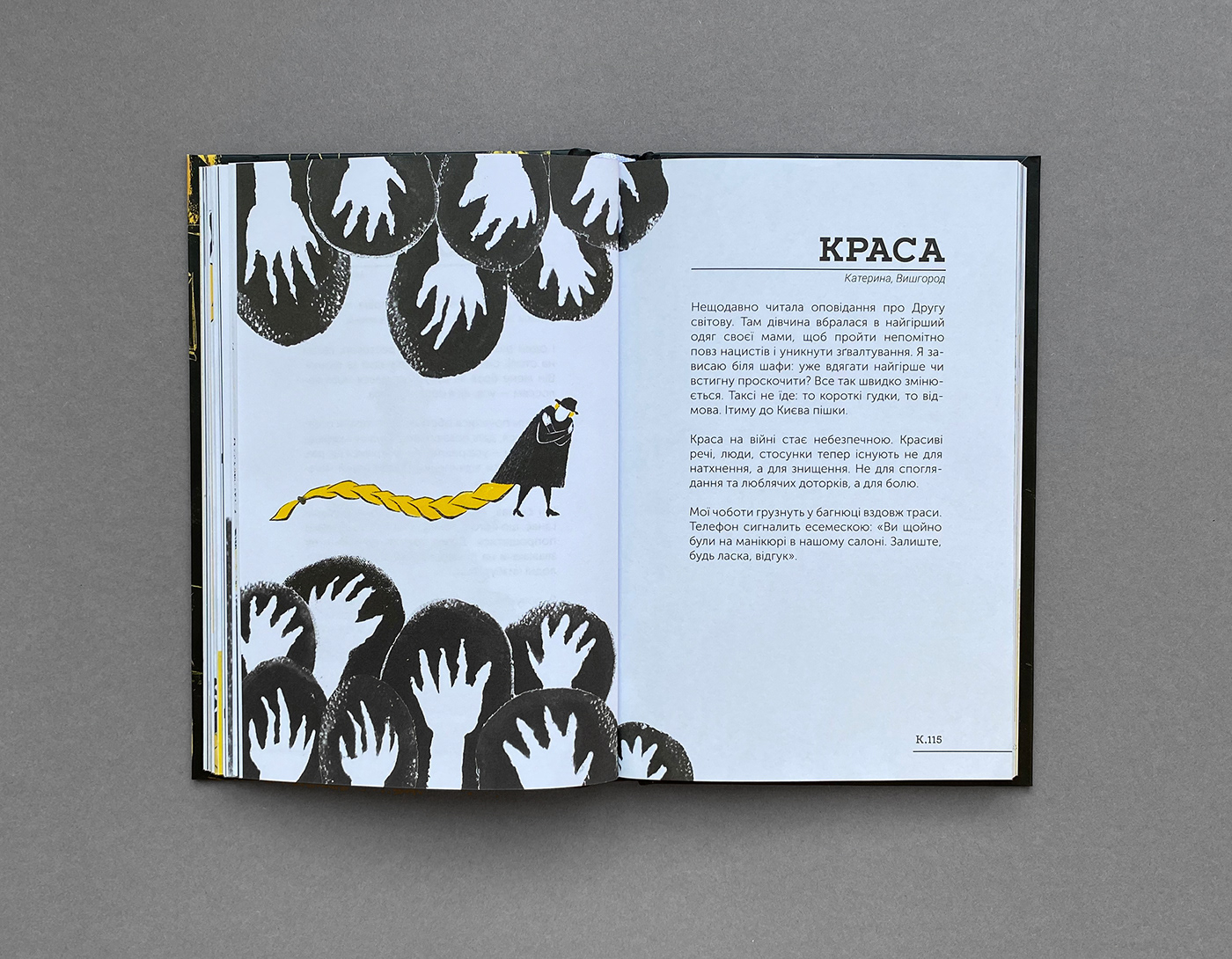 "Словник війни" — це особлива книга, яку написав і упорядкував Остап Сливинський. Вона увібрала понад 100 історій, розказаних очевидцями війни. Вони по-гемінґвеївськи короткі (як оце: "Продаються дитячі черевички. Неношені") і приголомшливо емоційні (сумні, страшні, з проблисками надії). Це важко читати. Щоб не бити читача "під дих" ще й візуальними образами, ми придумали робити ілюстрації метафоричними та водночас правдивими. Наприклад, малюнки до історій "Календар", "Печера, "Кімната". В них мало деталей, але вони ідеально передають емоцію.