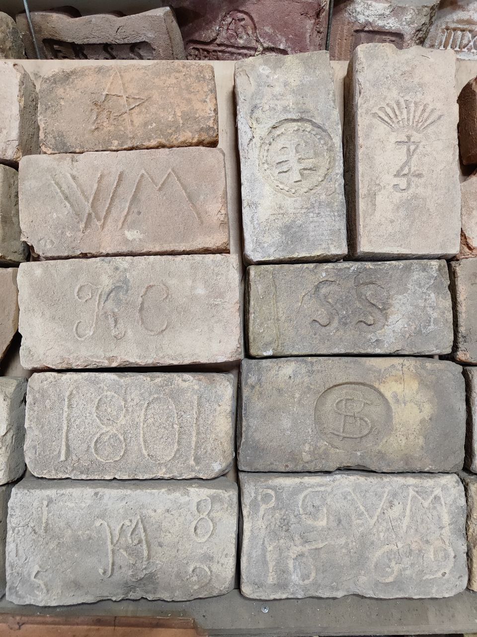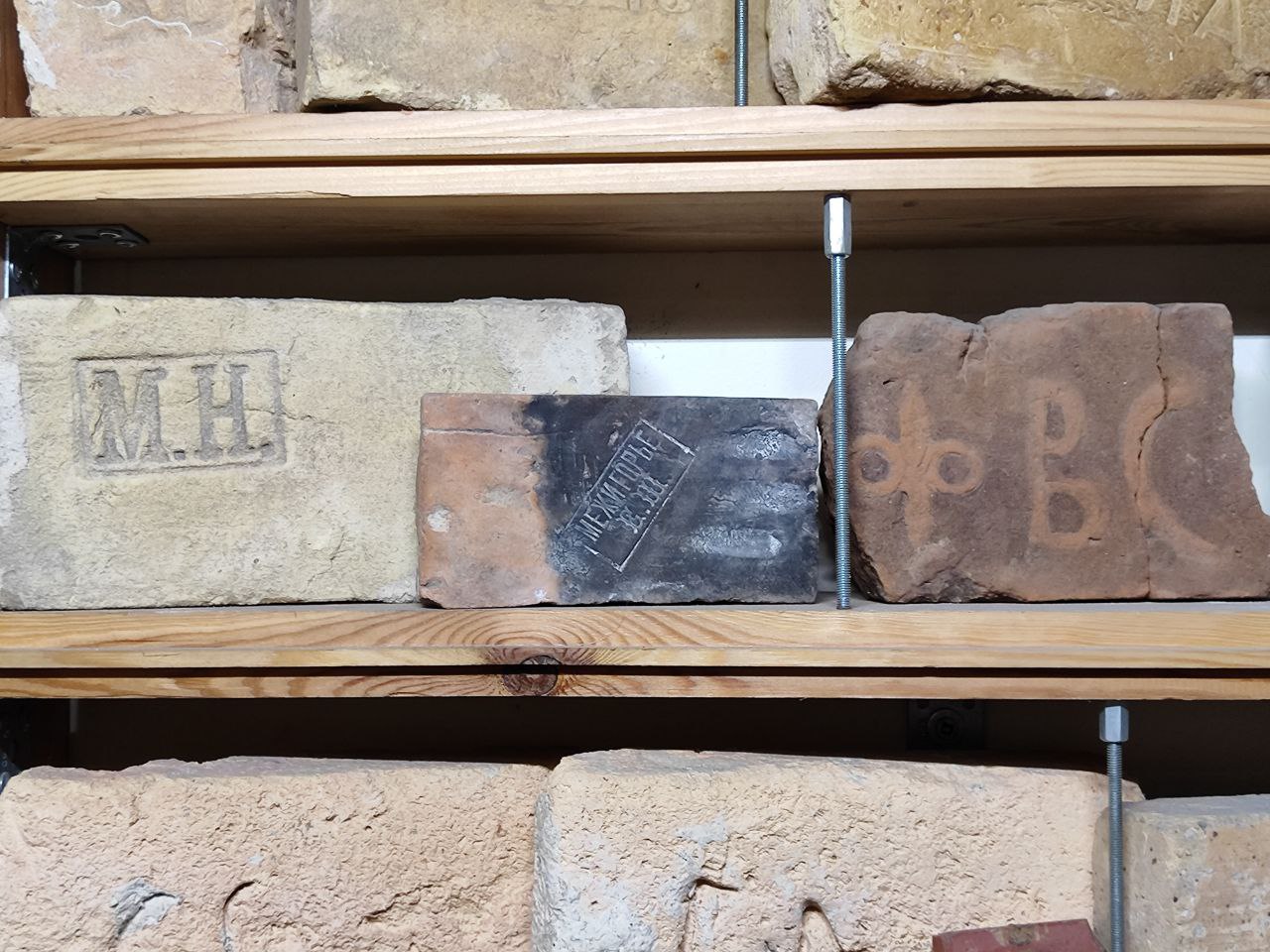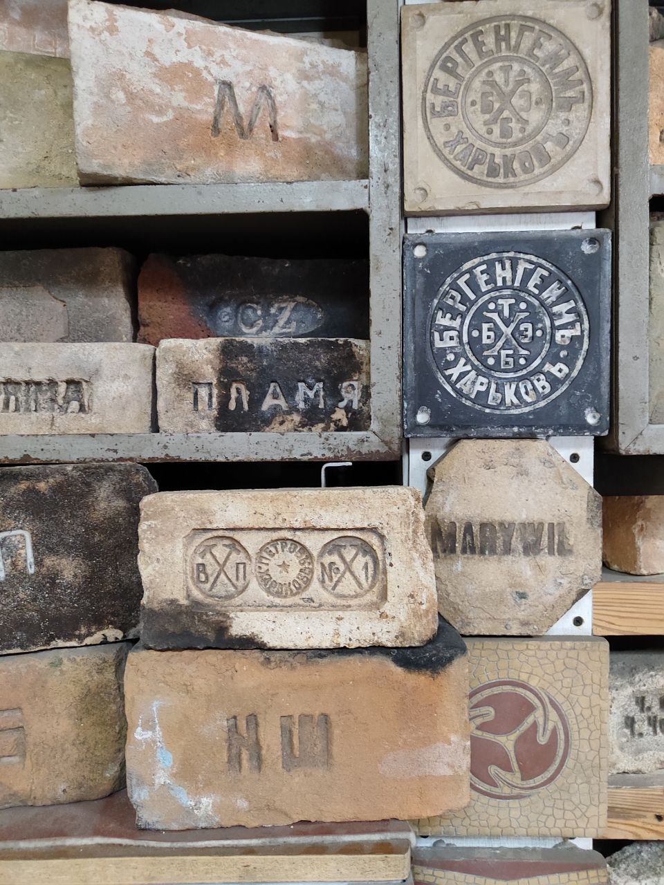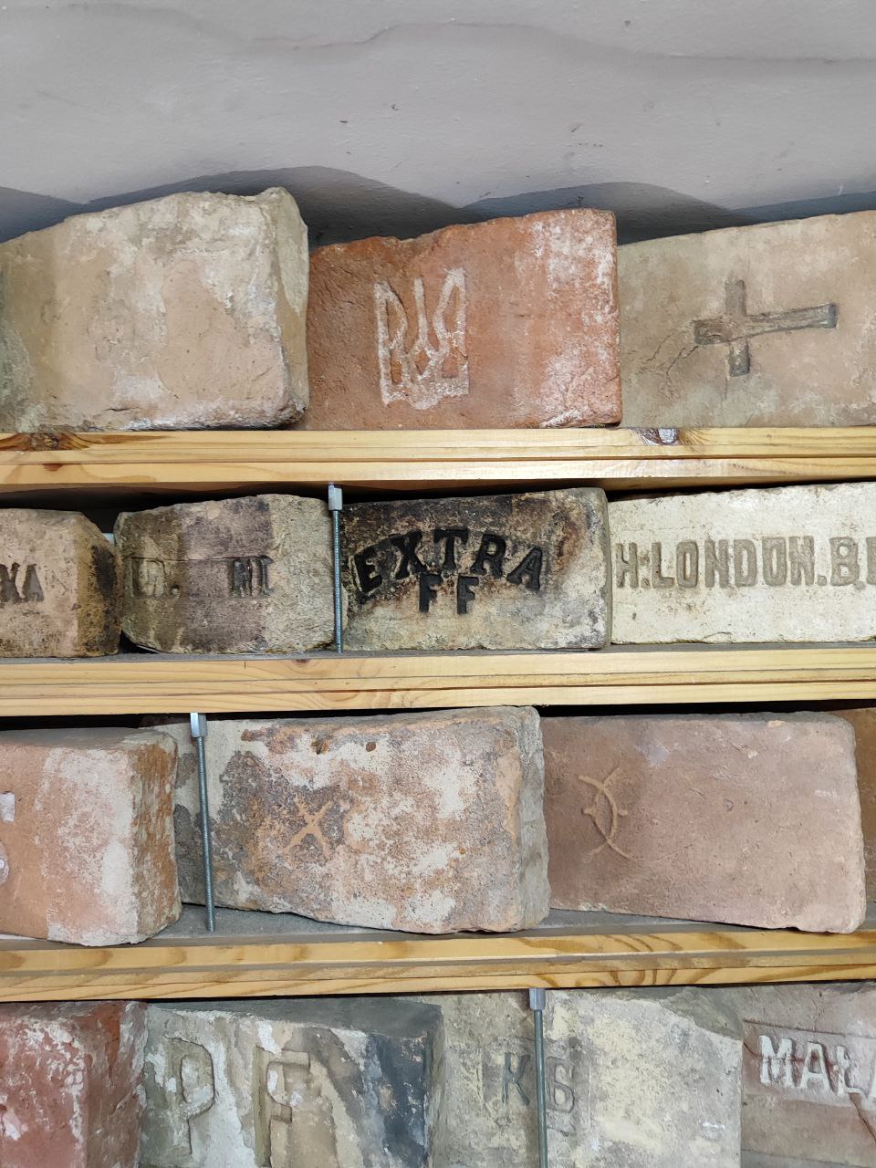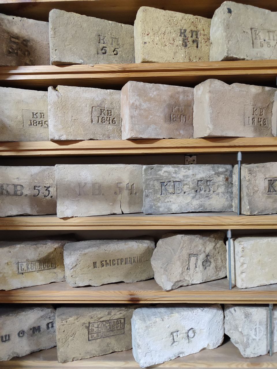 Кинув. Насправді це тільки на початку цікаво: 10 штук, 30, о, 50! А потім ти просто перестаєш цим перейматися. Кількість не головне. Проте мої друзі порахували, що плюс-мінус десь 1000 цеглин. Кожен із цих стелажів (показує на власноруч зроблені полиці. — Прим. авт.) тримає на собі вагу у 0,5-1,5 тонни. З них десь за 300 штук — це київська цегла: Зайцева, Снежка, Ріхерта, Бернера та інших поважних осіб, що виробляли цеглу. Є навіть цегла з такого "режимного об'єкта", як Київська фортеця: вона має клейма з роком виготовлення та літерами К, КП та КВ.