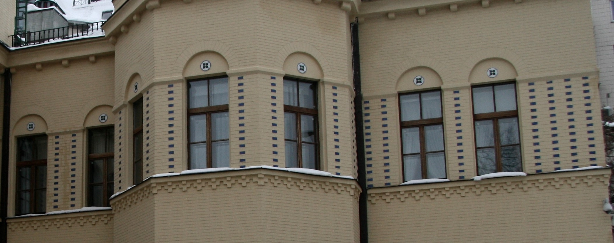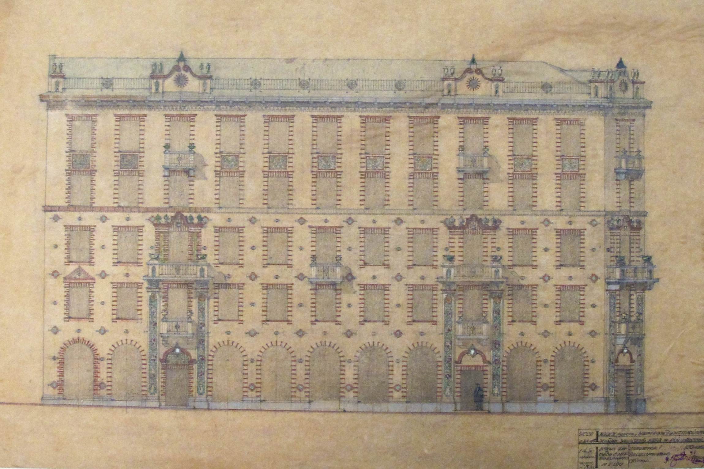 Архітектор створив фактурний контраст цегляного мурування та орнаментального майолікового панно верхніх поверхів, стриманий квітковий малюнок якого розробив сам. Виконали ж плитки, ймовірно, на відомому художньо-керамічному виробництві П. Вауліна й О. Гельдвейна.