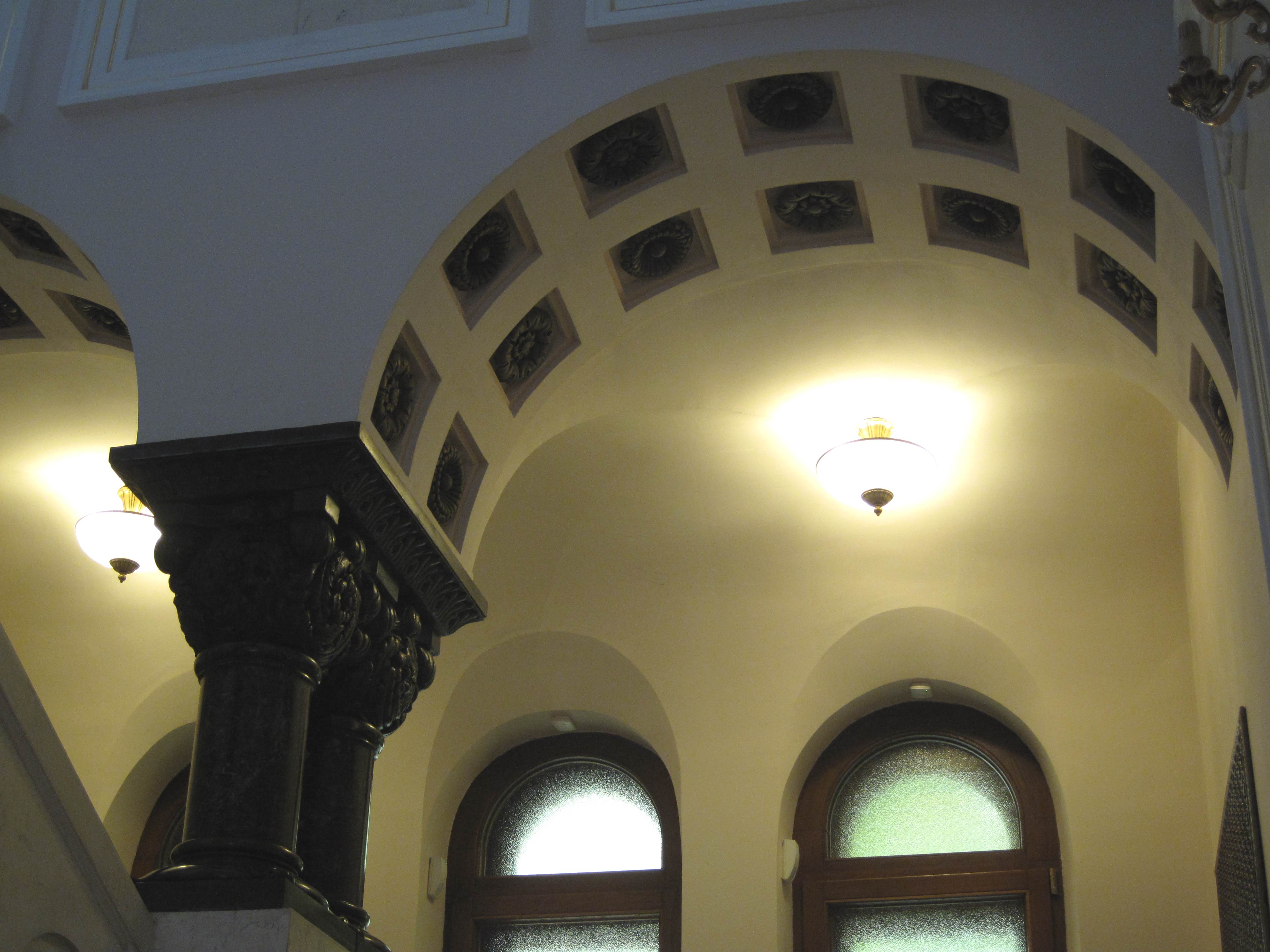Найбільш виразним елементом білосніжної будівлі з куполом є багатофігурний скульптурний фриз на тему просвітництва.