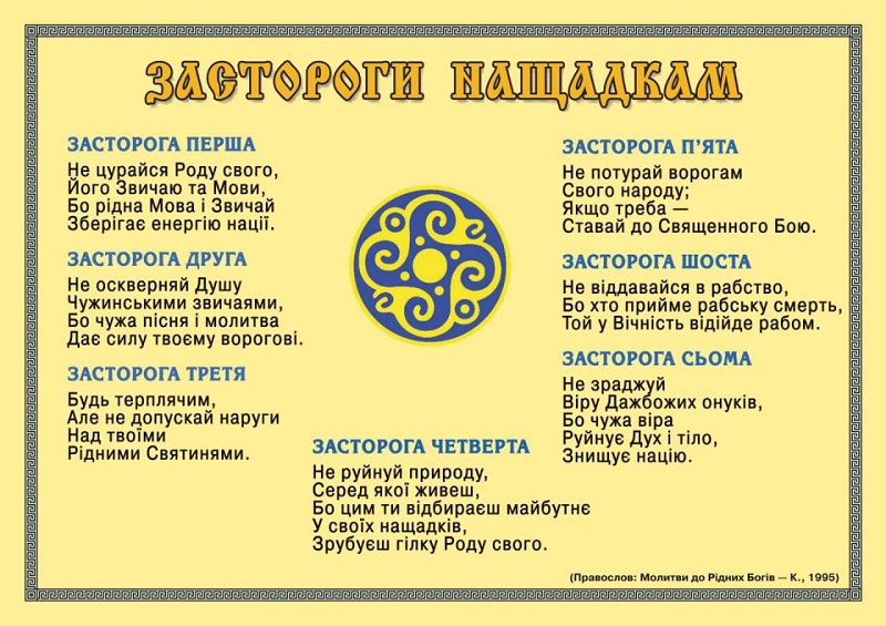 Головними цінностями українських рідновірів є філософія вічного життя, обожнювання природного начала Всесвіту, радість існування на землі. Вважаємо, що в потойбічний світ людина відходить такою, якою була за життя — або вільною і багатою, або нікчемним рабом, яким може бути вічно. Тому кожен із нас намагається за життя досягти найвищих почестей, шани, багатства, відзначитися на полі бою чи в повсякденній праці, тобто намагається чинити так, як це робили наші славні предки. Це відображено в Засторогах нащадкам, викладених у нашому молитовнику "Правослов", яких ми намагаємося дотримуватися: