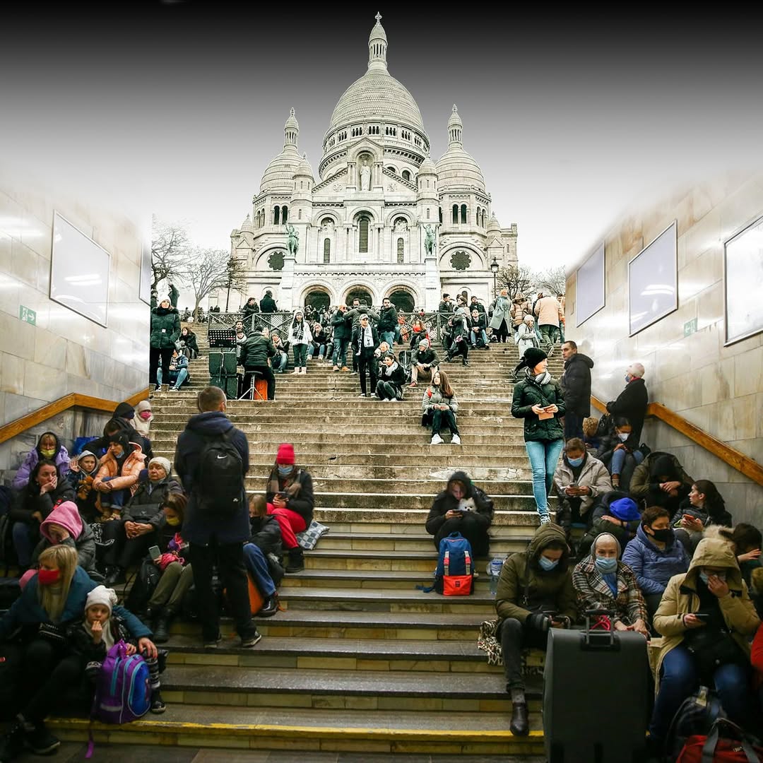 24 лютого 2022 року я пережила глибокий емоційний удар і відчула безсилля. Мене охопили почуття провини та справжня фрустрація. Мої думки були з Україною. Тоді я опублікувала в соціальних мережах свій перший колаж — сходи Сакре-Кер у Парижі, поєднані зі зробленим Славою Ратинським фото київського метро, де люди ховалися від обстрілів.