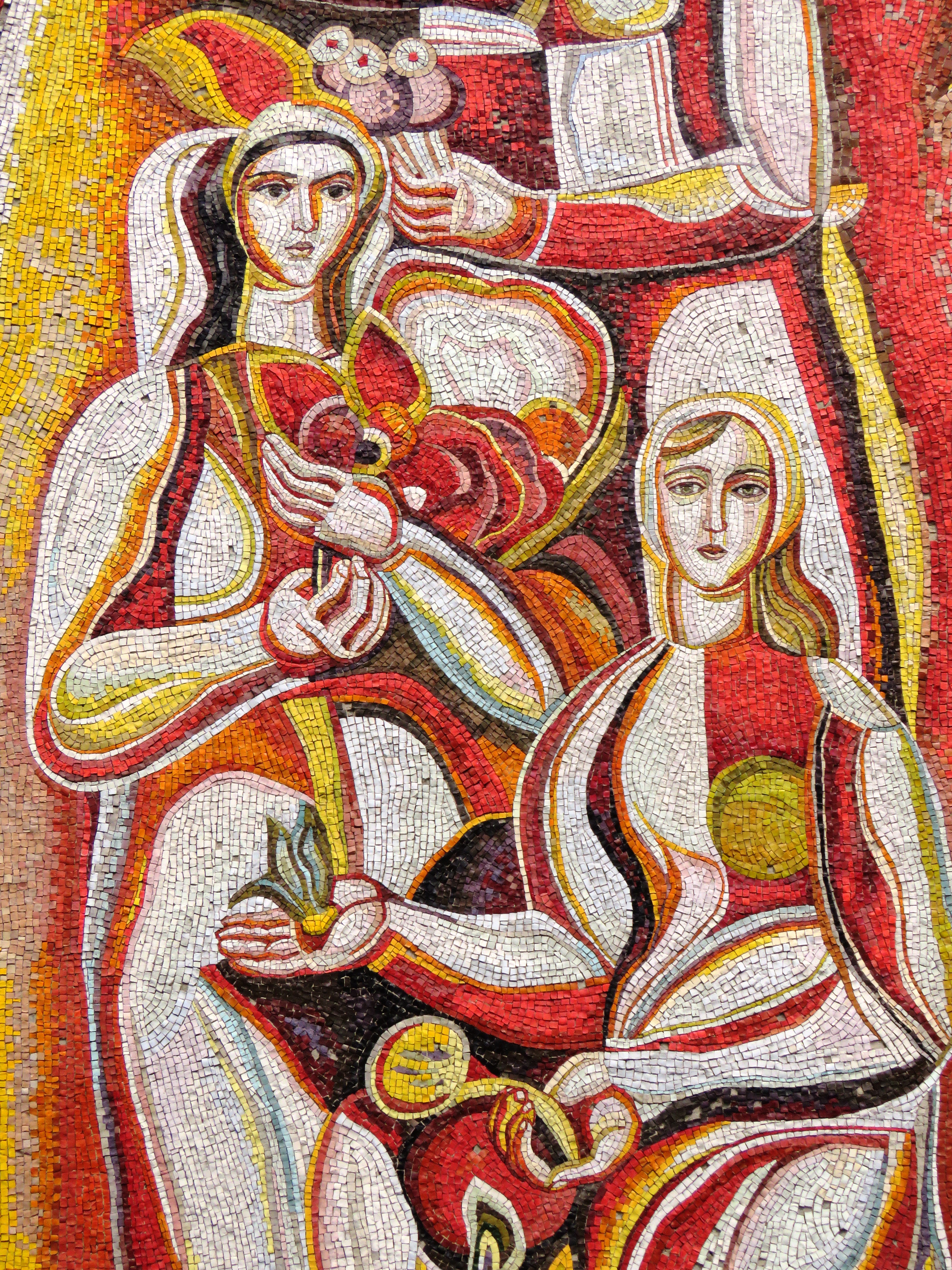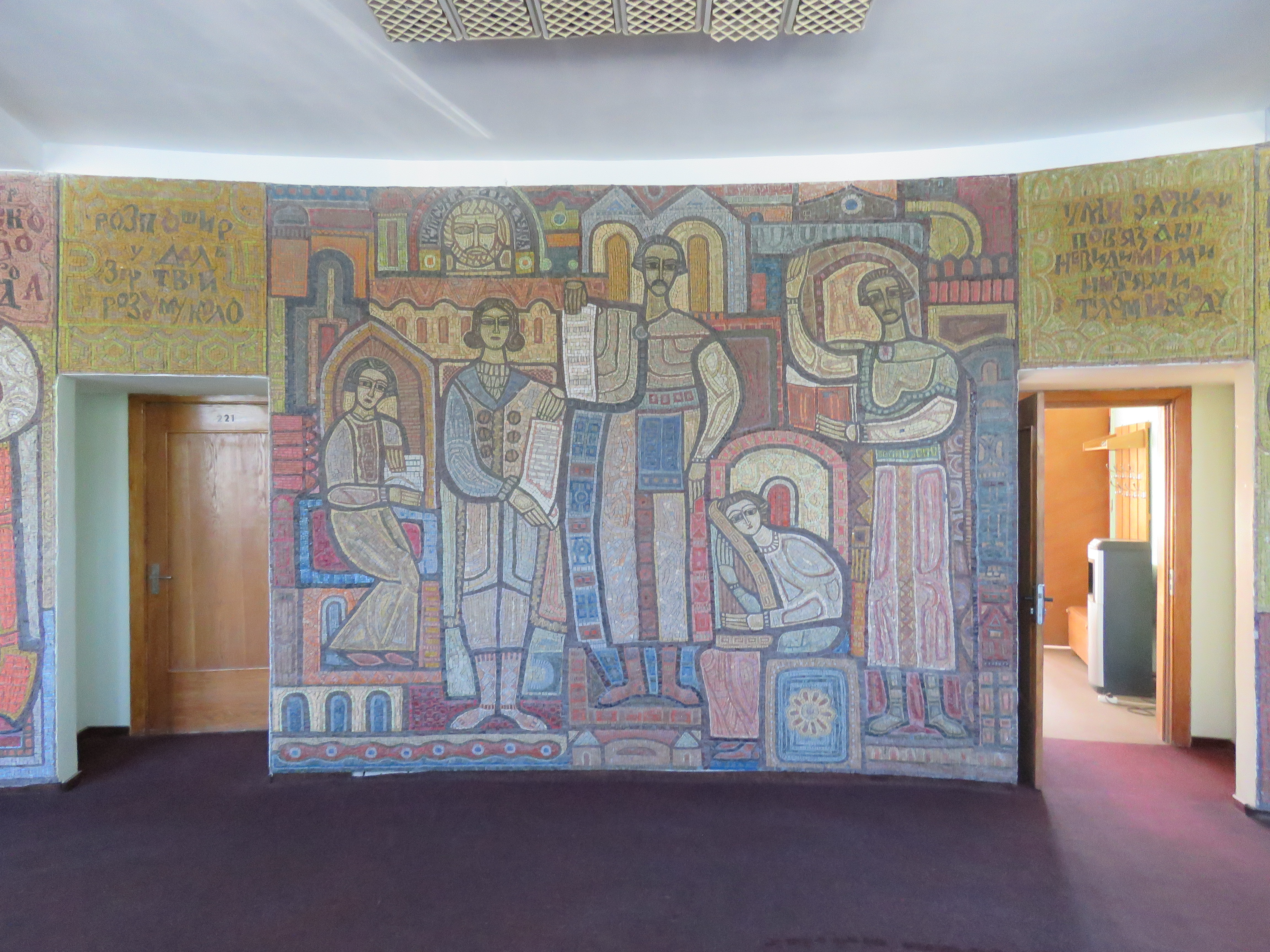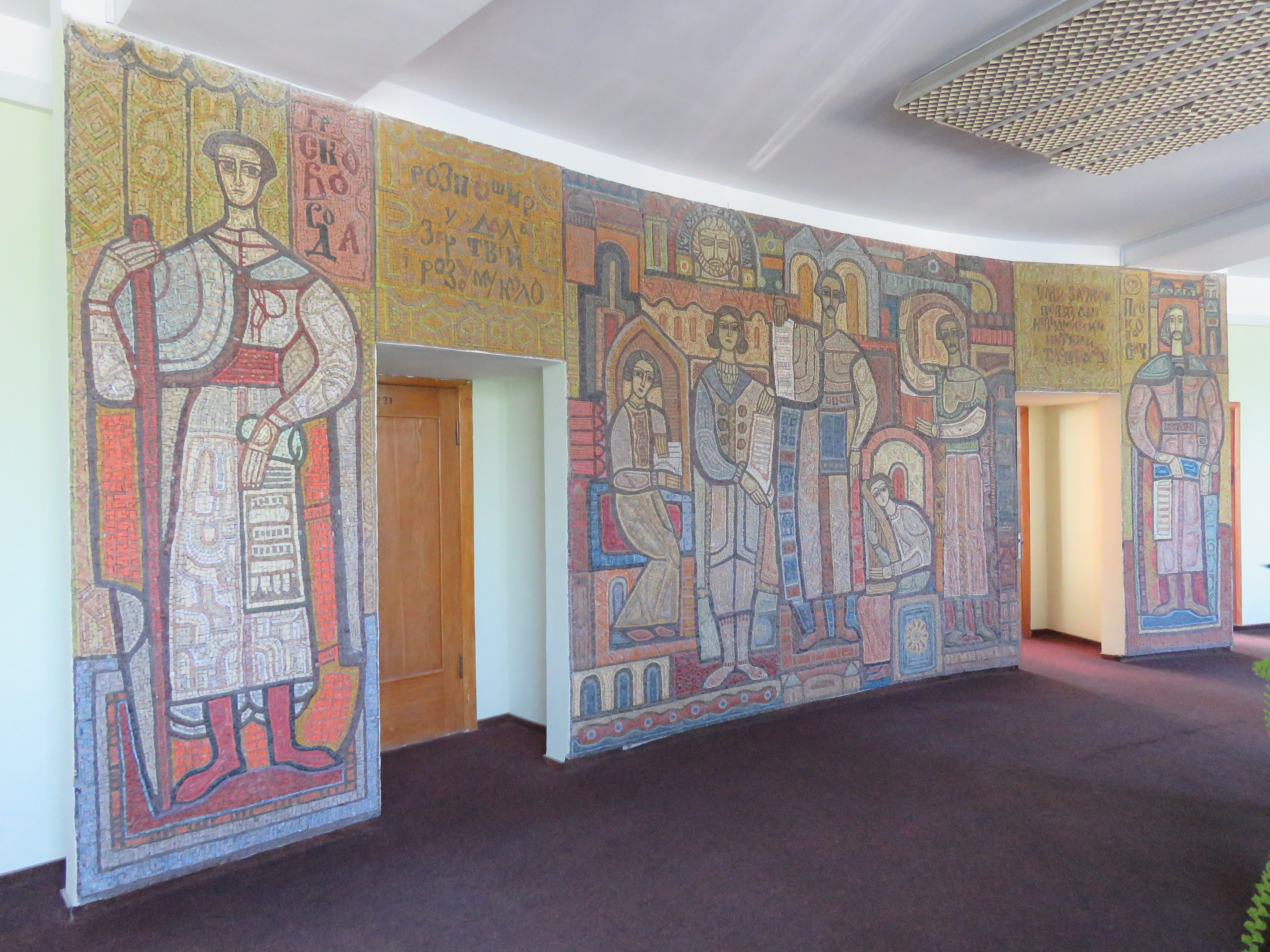 Смальтове панно виконане у традиціях давньоруського стінопису. Вражає насичена кольорова гама: червона, золота, вохриста. Над дверима — уривки зі статуту братства.