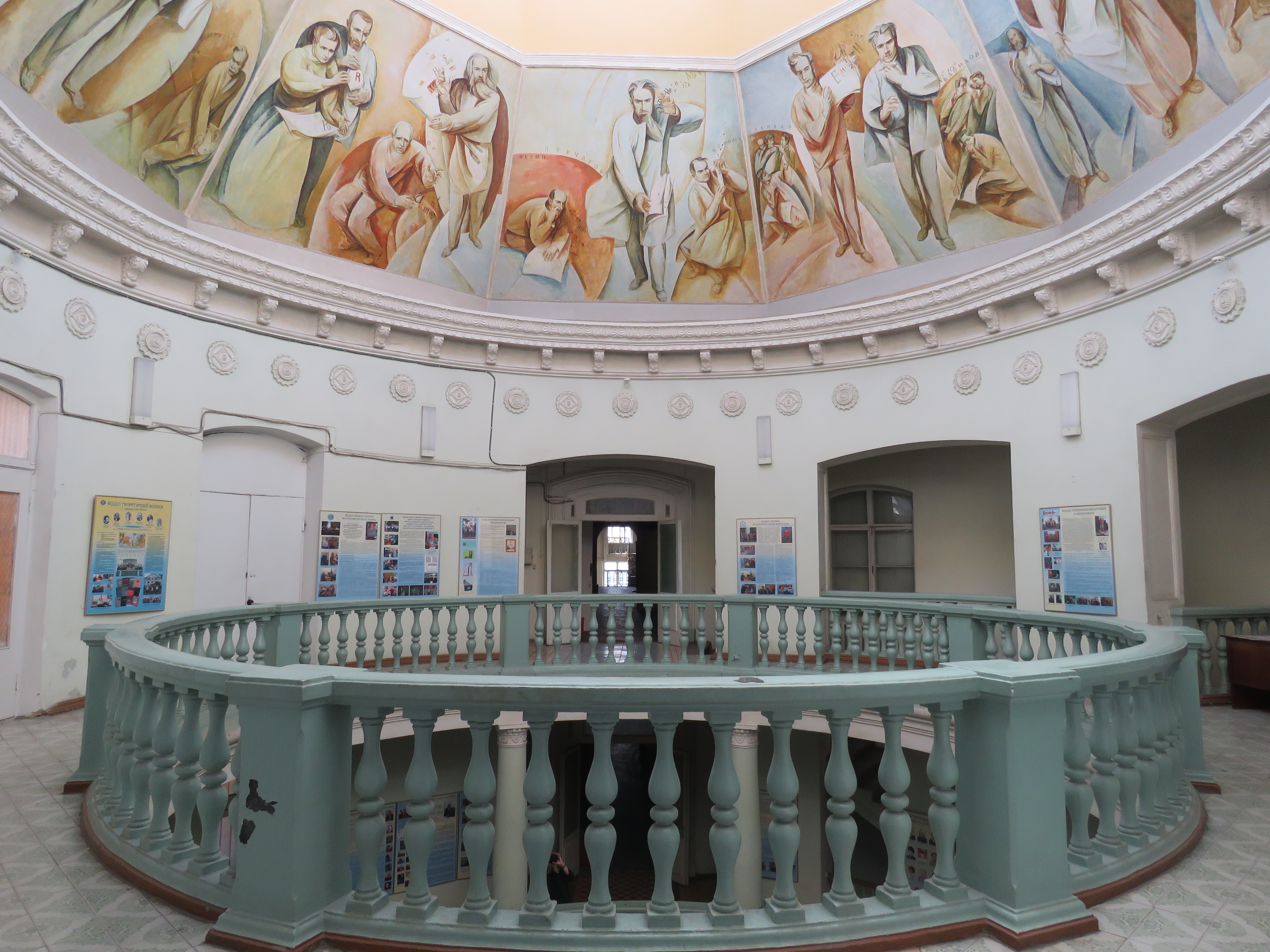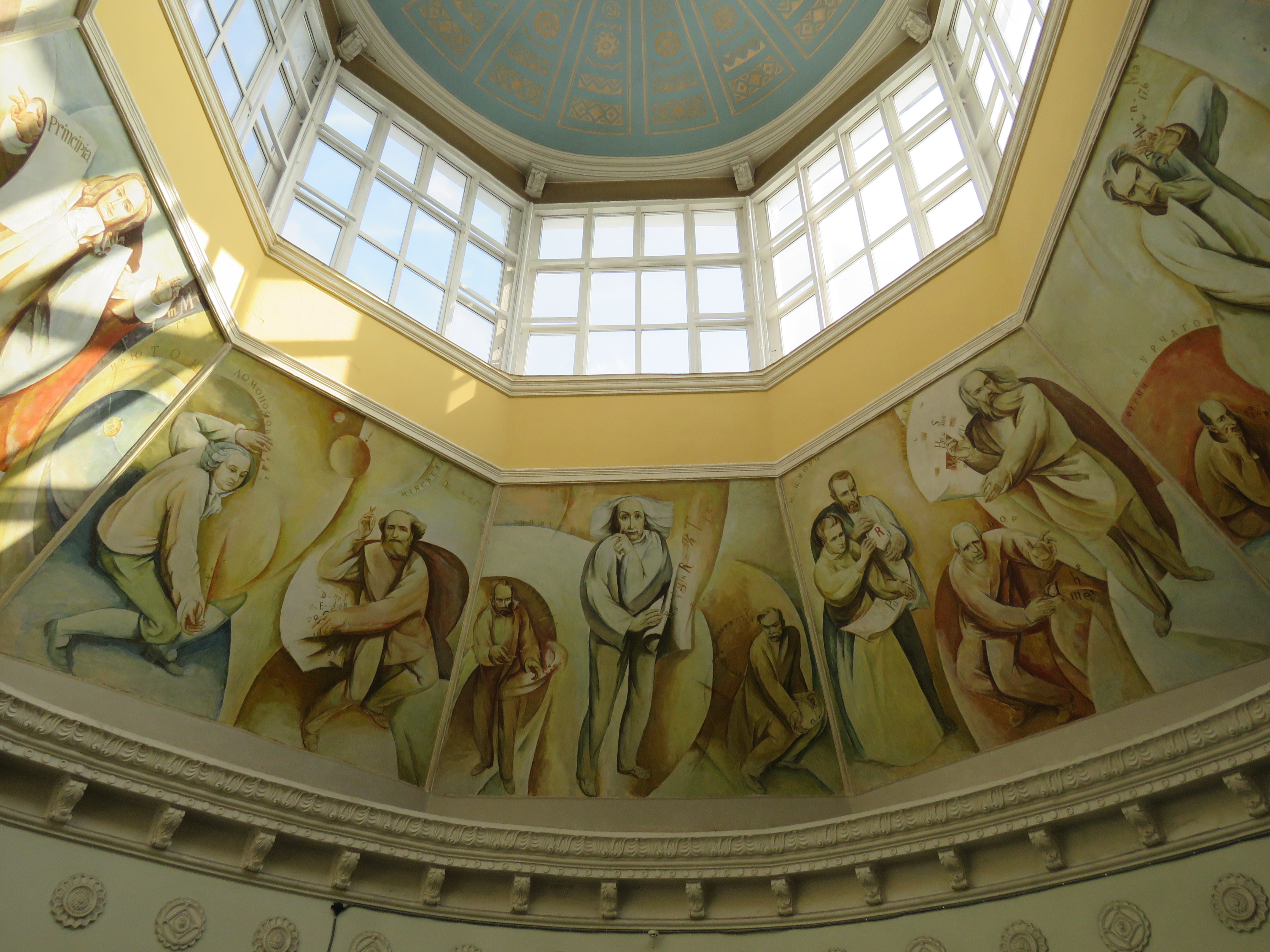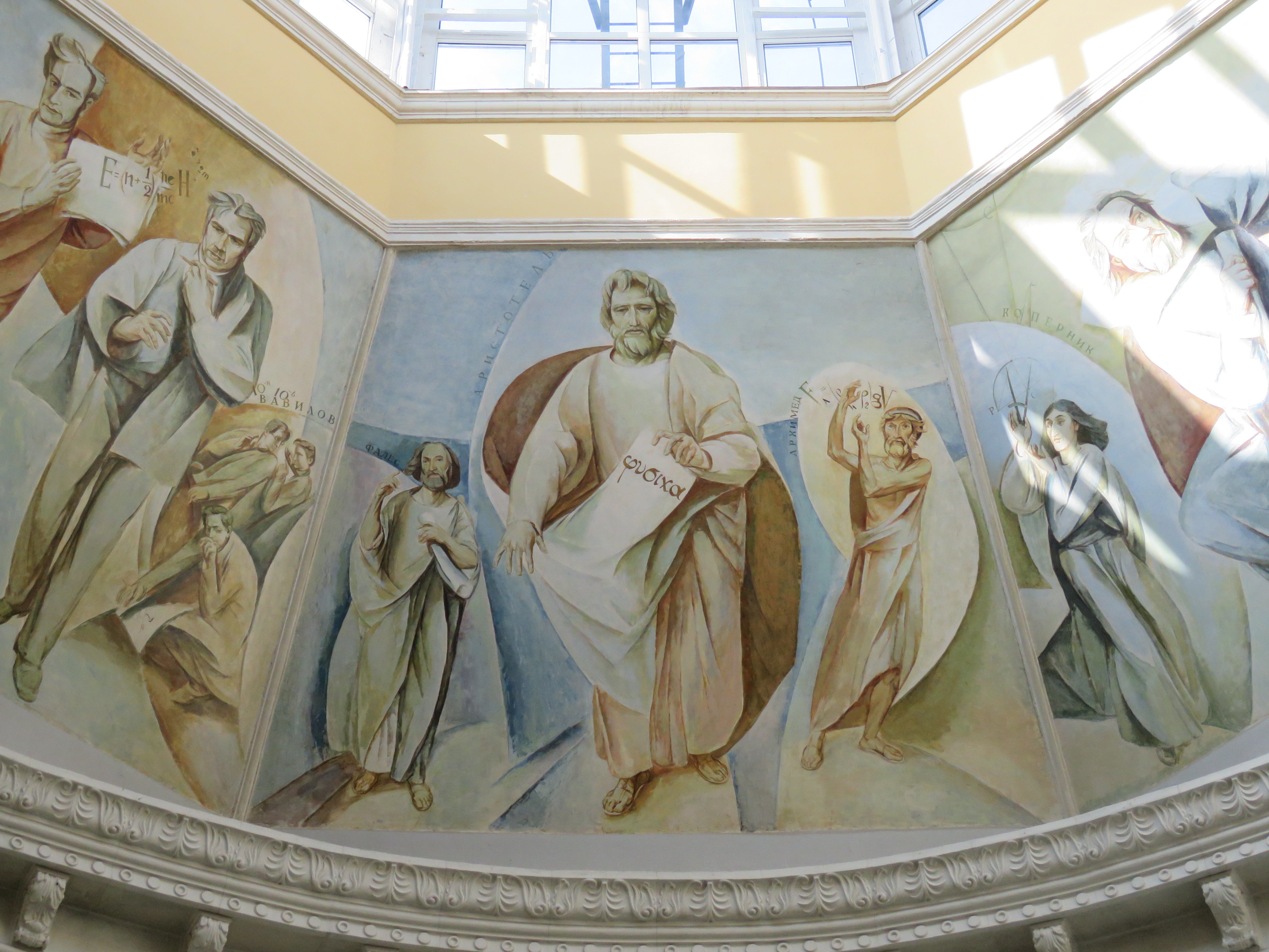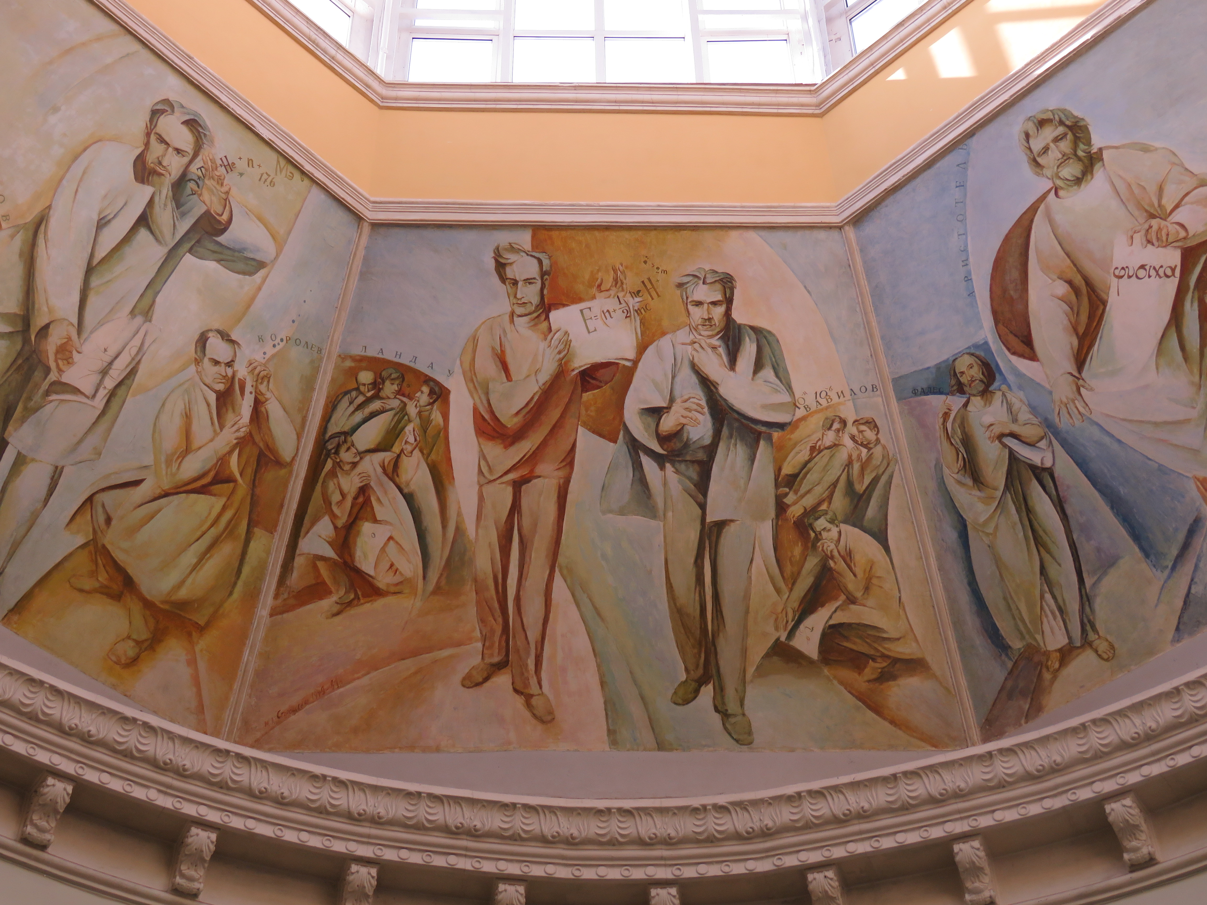 Як використати незручну площу з максимальною користю? Зробити в ній фрески! Із зображеннями справжніх ікон науки: Ейнштейном, Ландау, Вавіловим, Архімедом, Арістотелем тощо.