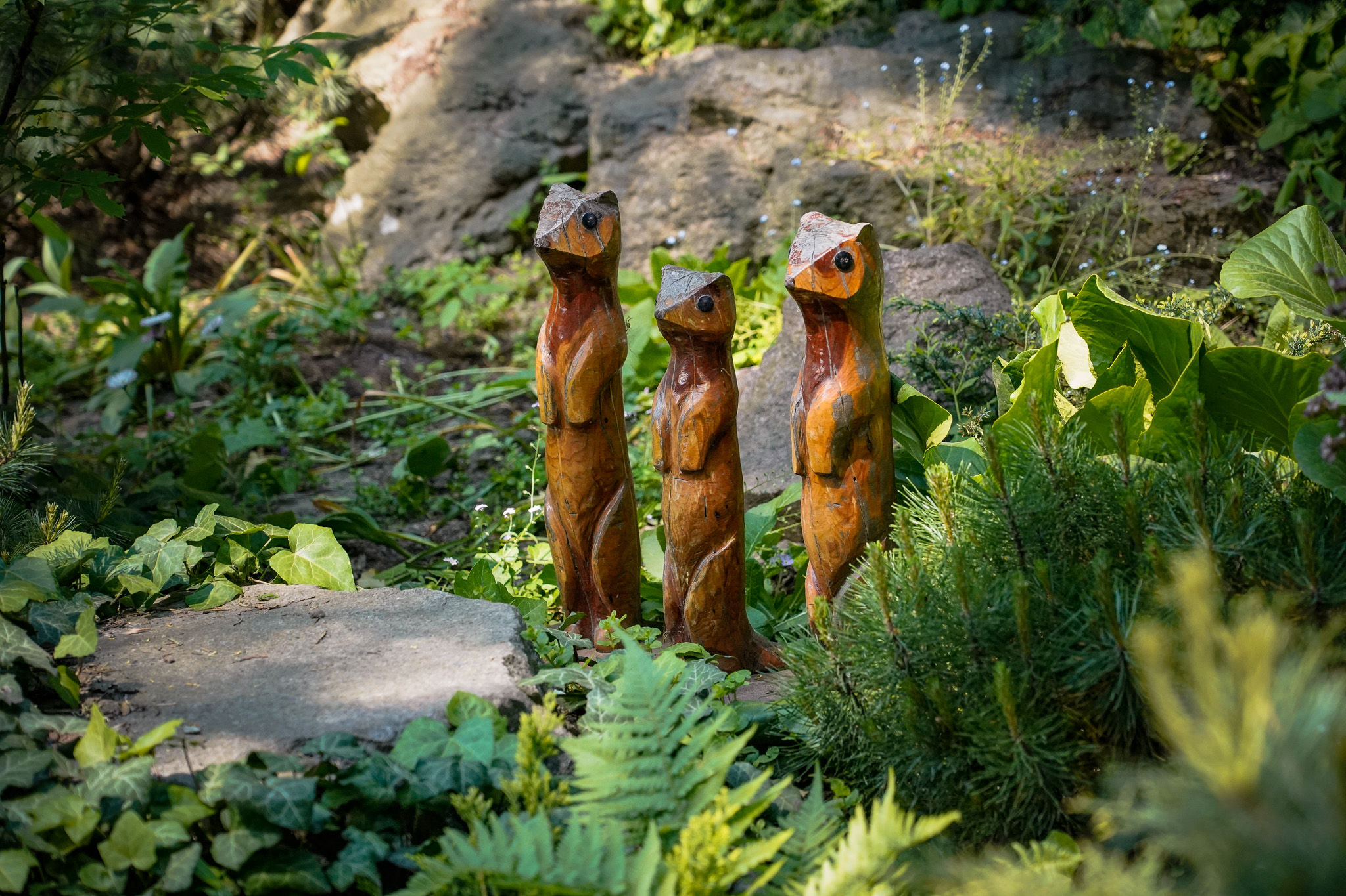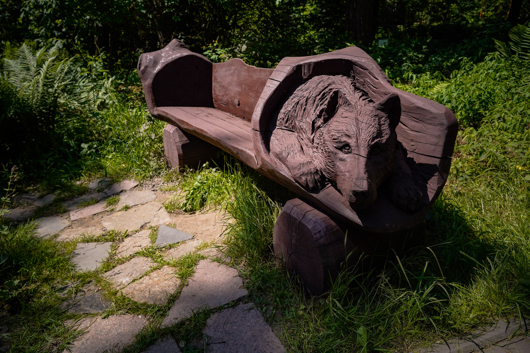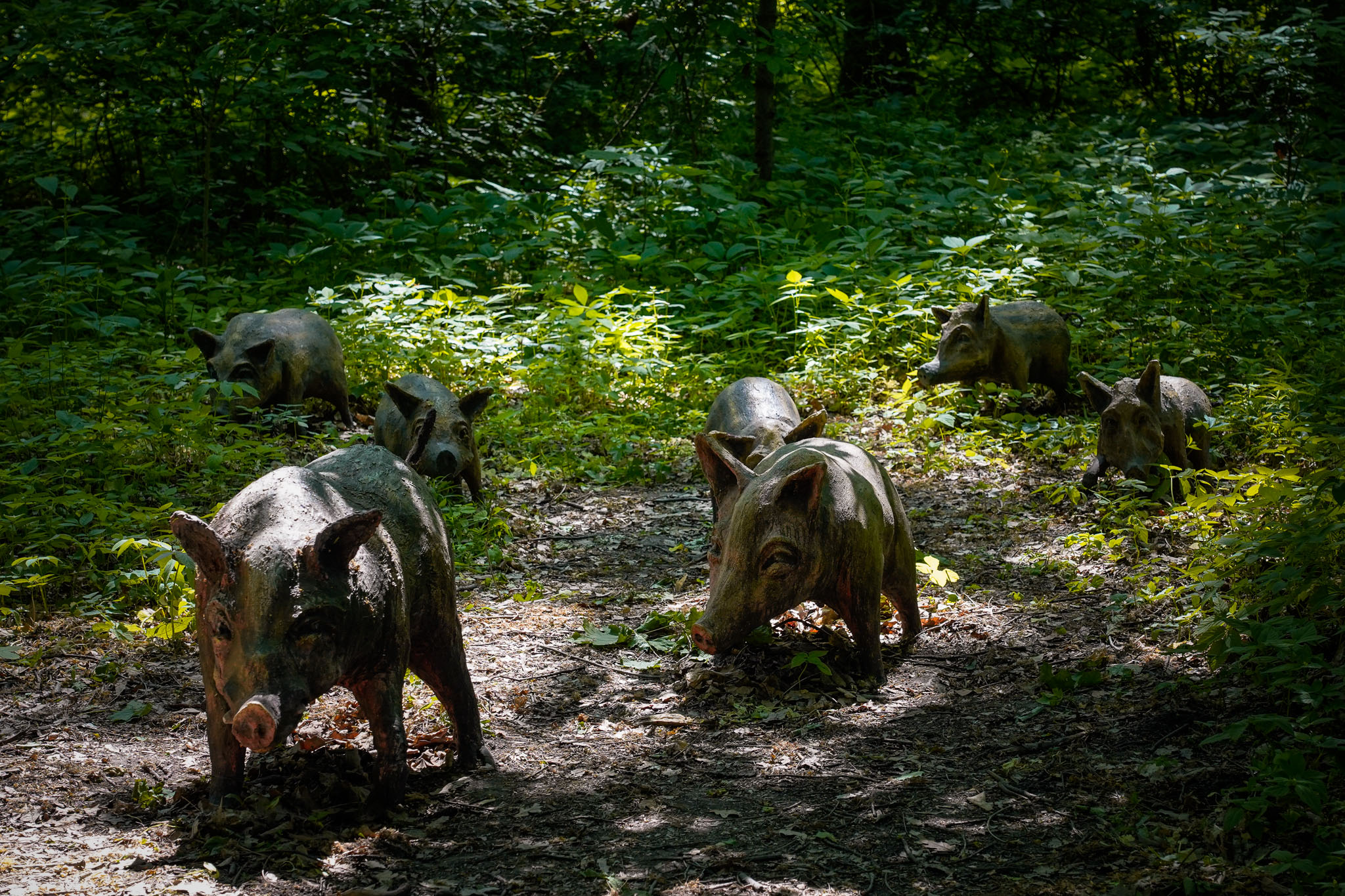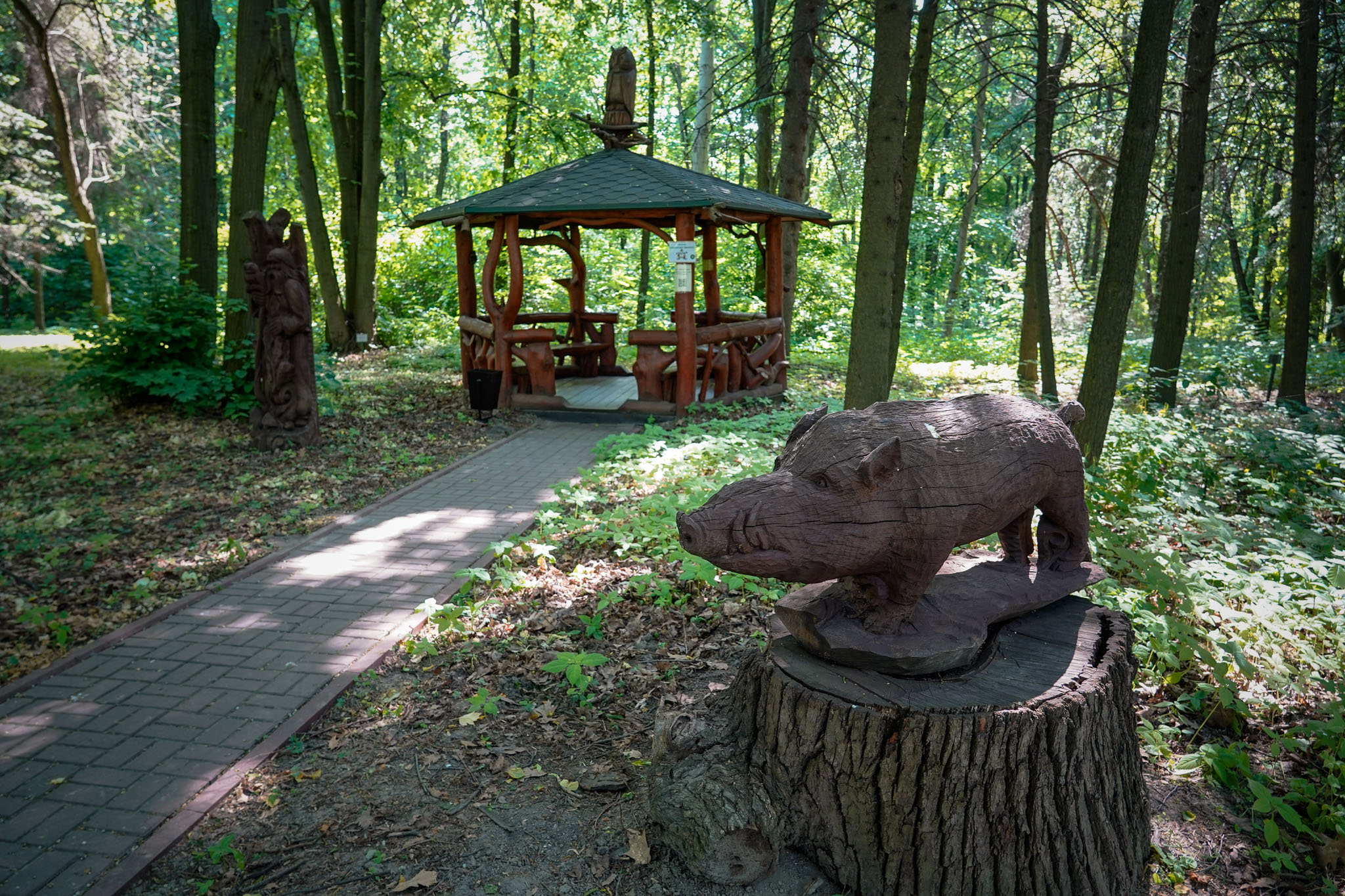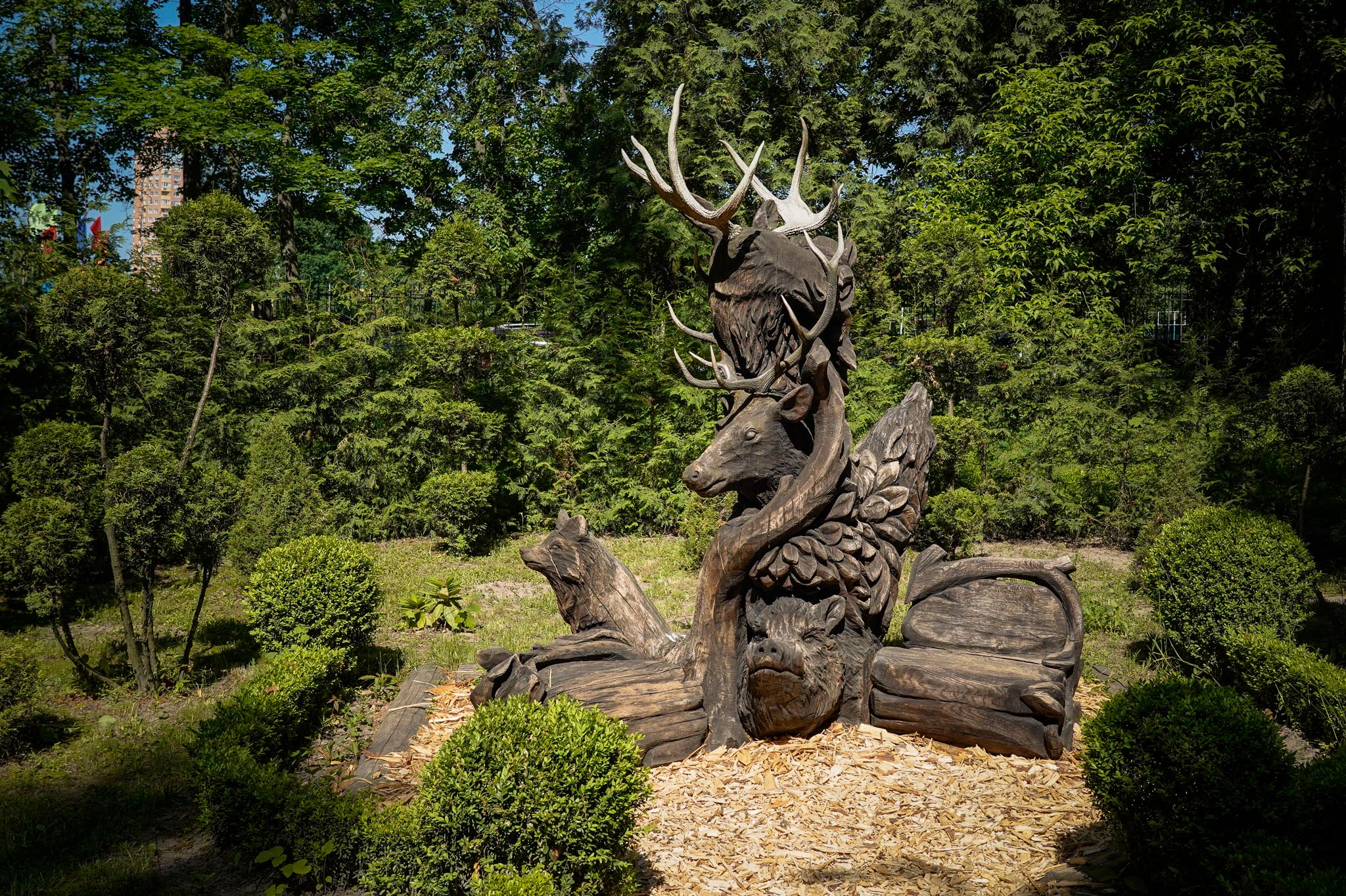 До речі, про фотографування. У парку розташована майже сотня скульптур, усі з дерева та бетону. При цьому вони не бездумно понатикані – аби було, а вписані в середовище дуже тактовно. Отже, у саду живуть родина кабанів, велетенський орел, лисиці, рись, ведмеді та інша дерев'яна фауна. І зроблені вони настільки класно, що з ними не тільки селфі хочеться зробити, а й рукою за вушком "почухати"!