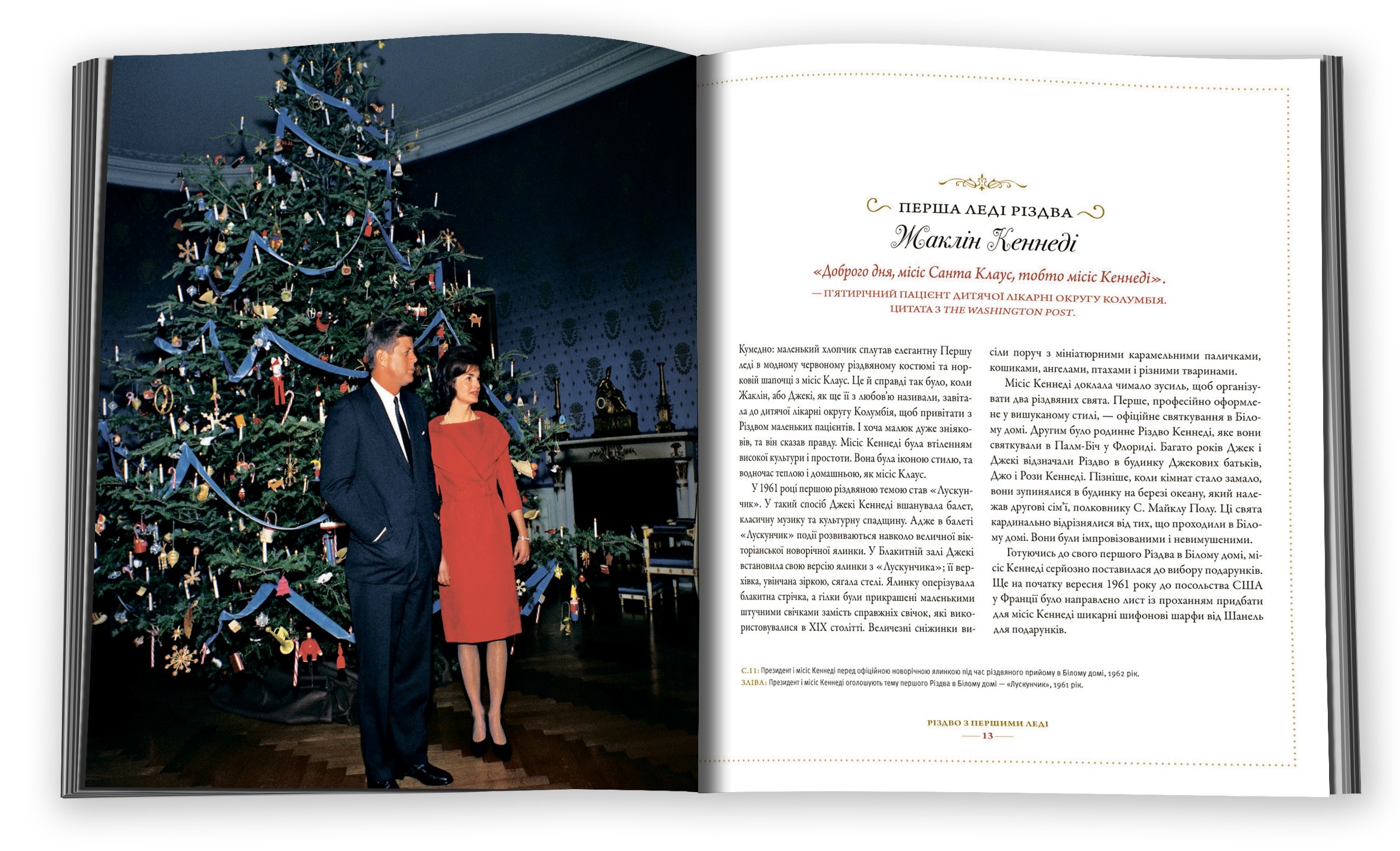 Частинка Білого дому у власній оселі. З цієї книжки ти дізнаєшся, як перші леді створювали різдвяний настрій. Різдвяний вертеп, живі квіти, антикварні іграшки, свіжовипечені смаколики – все це допомагає створити святкову атмосферу затишку. Наприкінці кожного розділу книжки ти знайдеш поради з виготовлення виробів чи фірмові рецепти перших леді: журавлинний салат Леді Берд Джонсон, знаменитий мавпячий хліб Ненсі Рейган або пряникові прикраси Мішель Обами. Також видання зможе розважити у святкові дні. Тут міститься багато кумедних історій сімейних фото президентів під час святкування зимових свят.