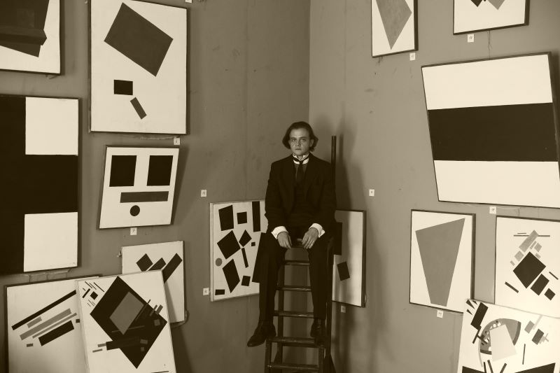 Що ж по Малевичу? Малевич з'являється у фільмі за лаштунками футуристичної опери "Победа над солнцем", прем'єра якої відбулася 1913 року в Санкт-Петербурзі — майбутній автор "Чорного квадрату" був у ній сценографом.