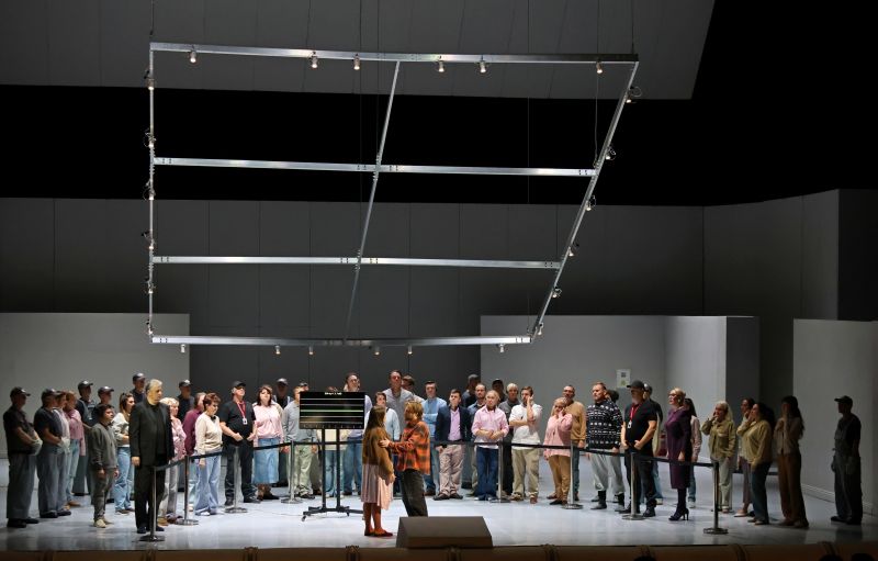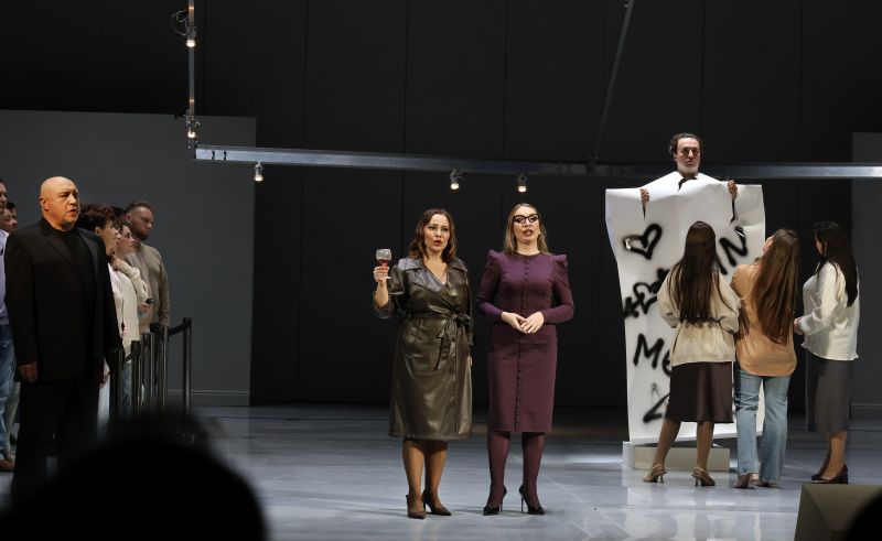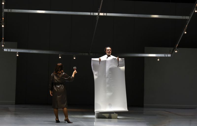 Дію опери Уривський переніс у наш час, а місцем для неї обрав музейний простір, де виставлені три живі інсталяції — Петро Богомазов побудував на сцені повноцінний павільйон, що імітує простір музею сучасного мистецтва, а суфлерську будку-равлика замінив на просту білу скриню.