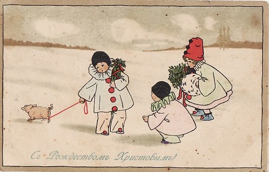 Більшість різдвяних листівок, що на початку ХХ століття продавалися в Києві, друкували за кордоном, тому часто на них були зображені не лише символи Різдва (зірка, вертеп, янголи чи дзвоник на гілці, що сповіщає про народження Ісуса Христа), а й не зовсім характерні для нашого регіону образи — наприклад, свині, які в різних культурах символізують добробут і достаток.