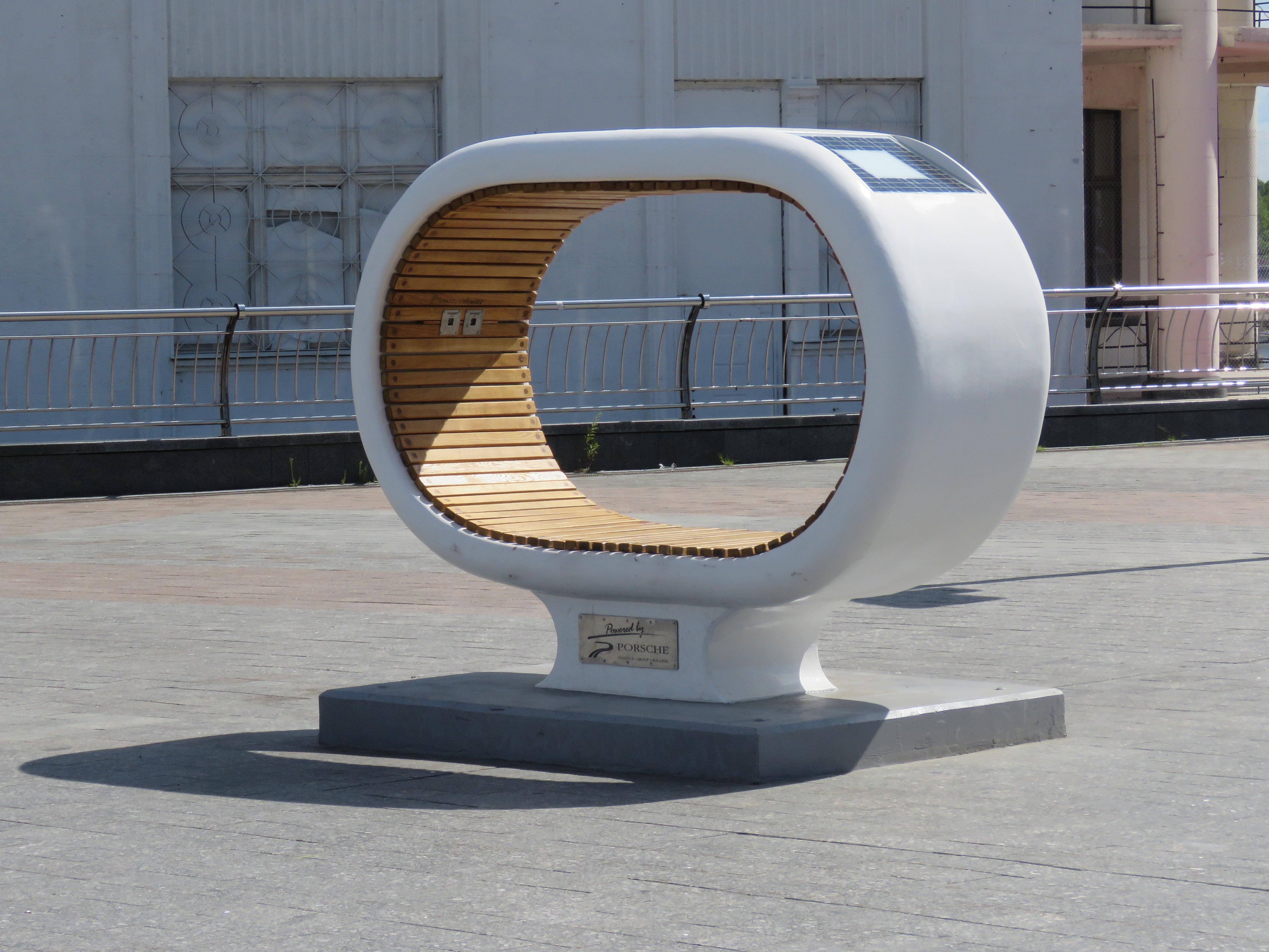 Ця футуристична лавка (в народі — "бублик") живиться від сонячної енергії та має чотири USB-порти. Її потужності цілком вистачає, щоб підзарядити ноутбук, планшет або телефон, які "помирають".