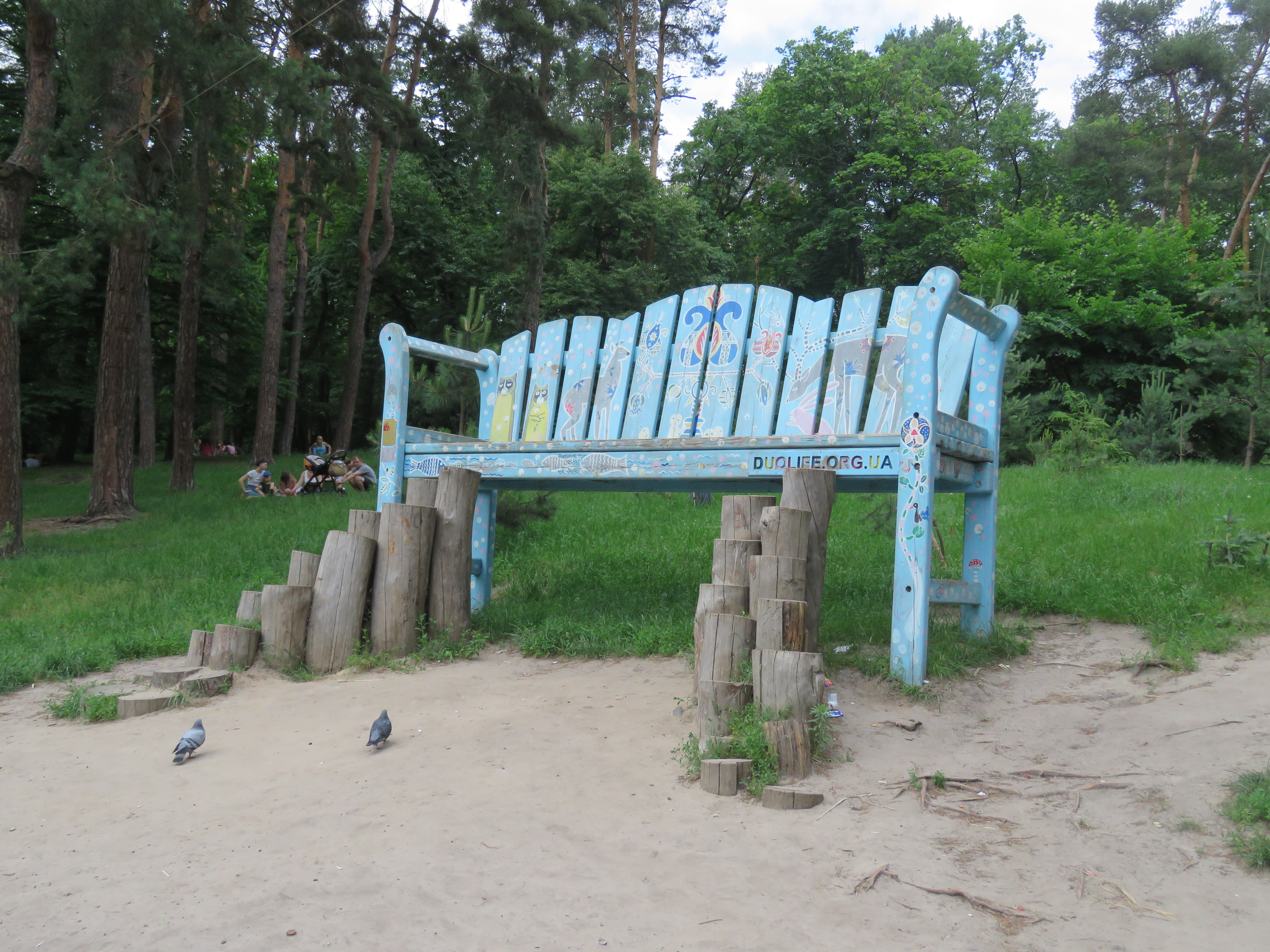 Ця лава-гігант встановлена у Голосіївському парку ім. М. Рильського. Це не просто цікава атракція. Це — спроба привернути увагу до проблем екології міста та відповідального ставлення до навколишнього середовища. Тобто лісу та парку. На лавці розміщено щемливий вірш Максима Тадейовича "Почорніли заводі в озерах". А ще її прикрашено графіті з котиками.