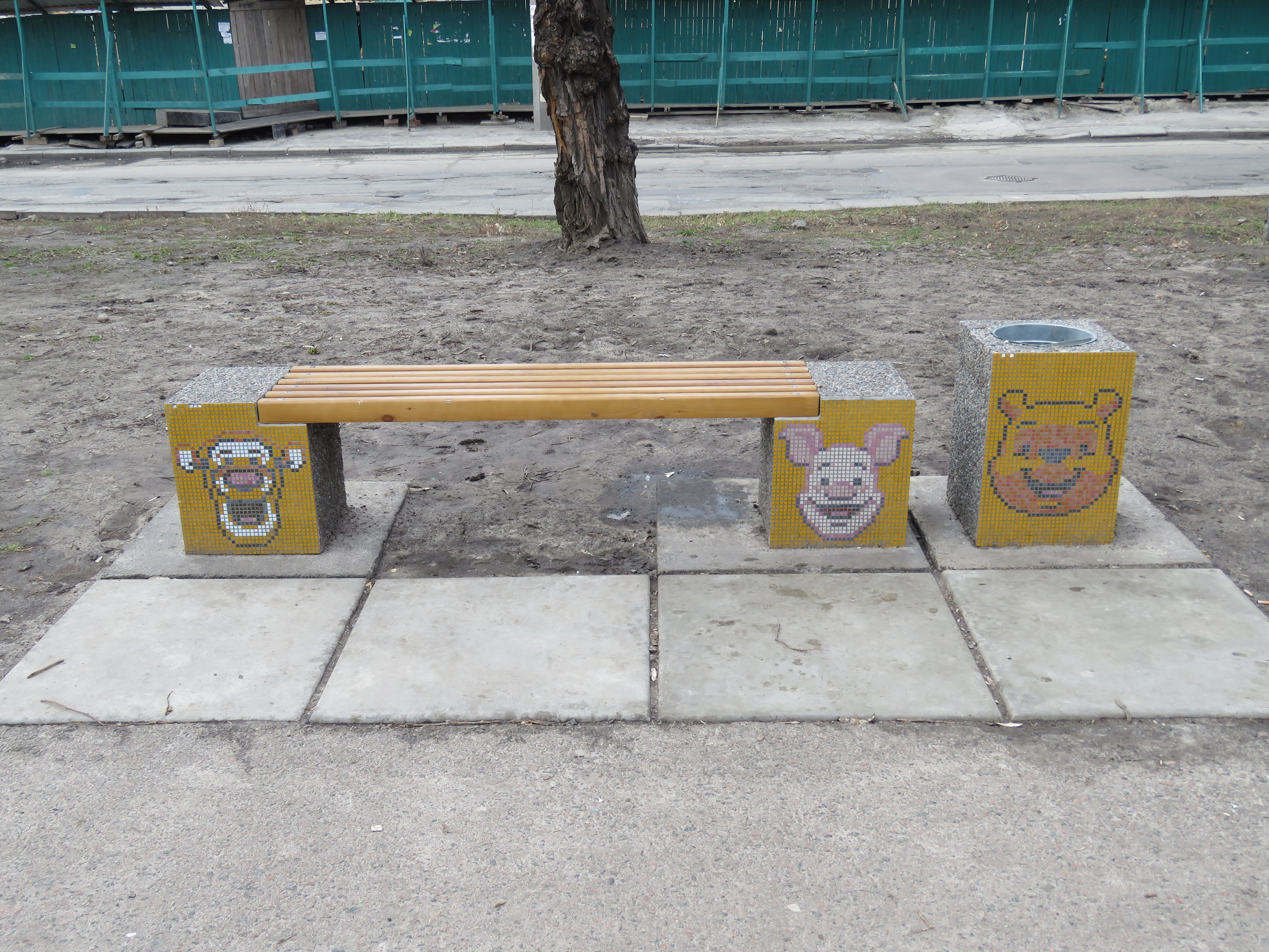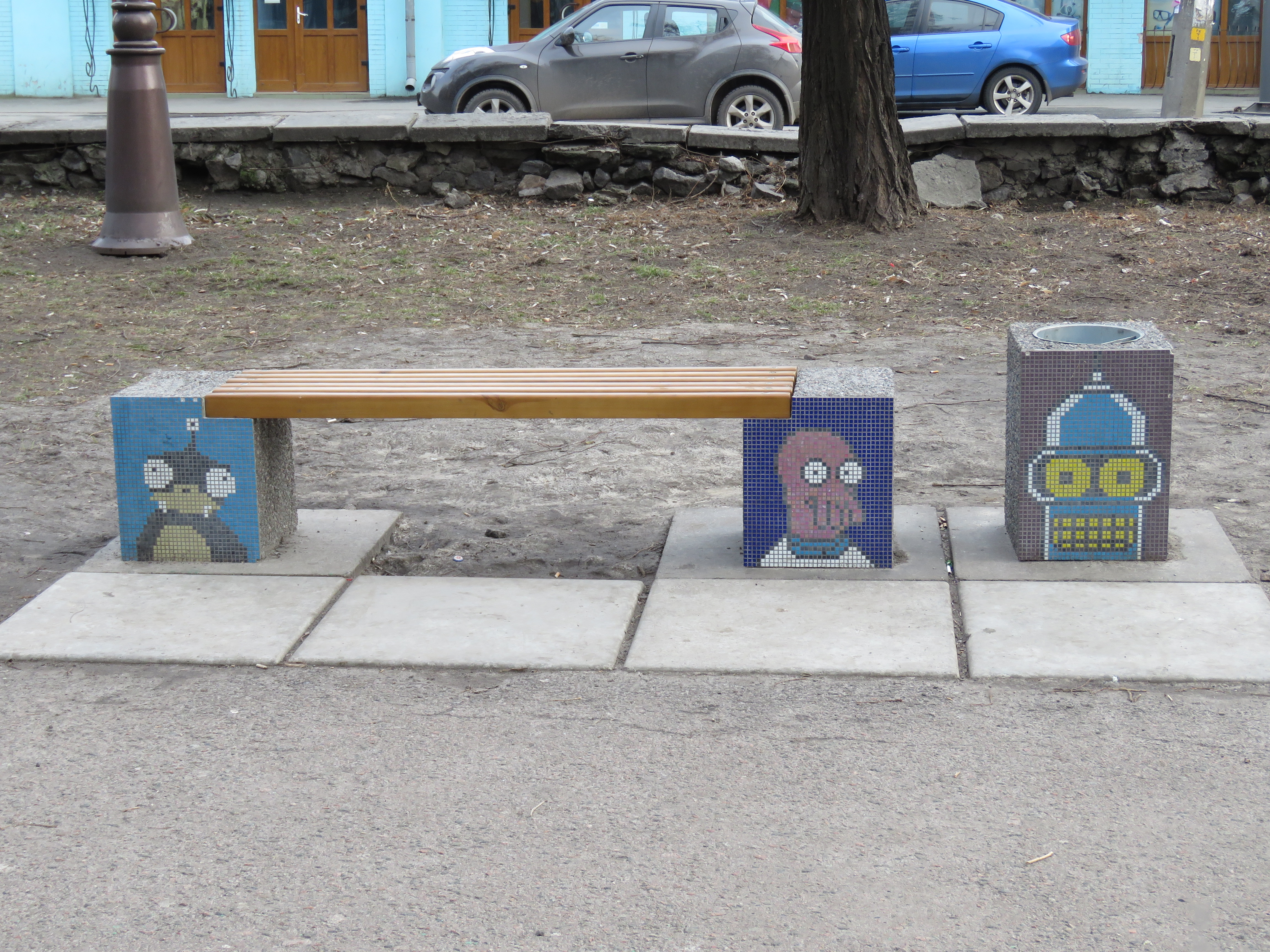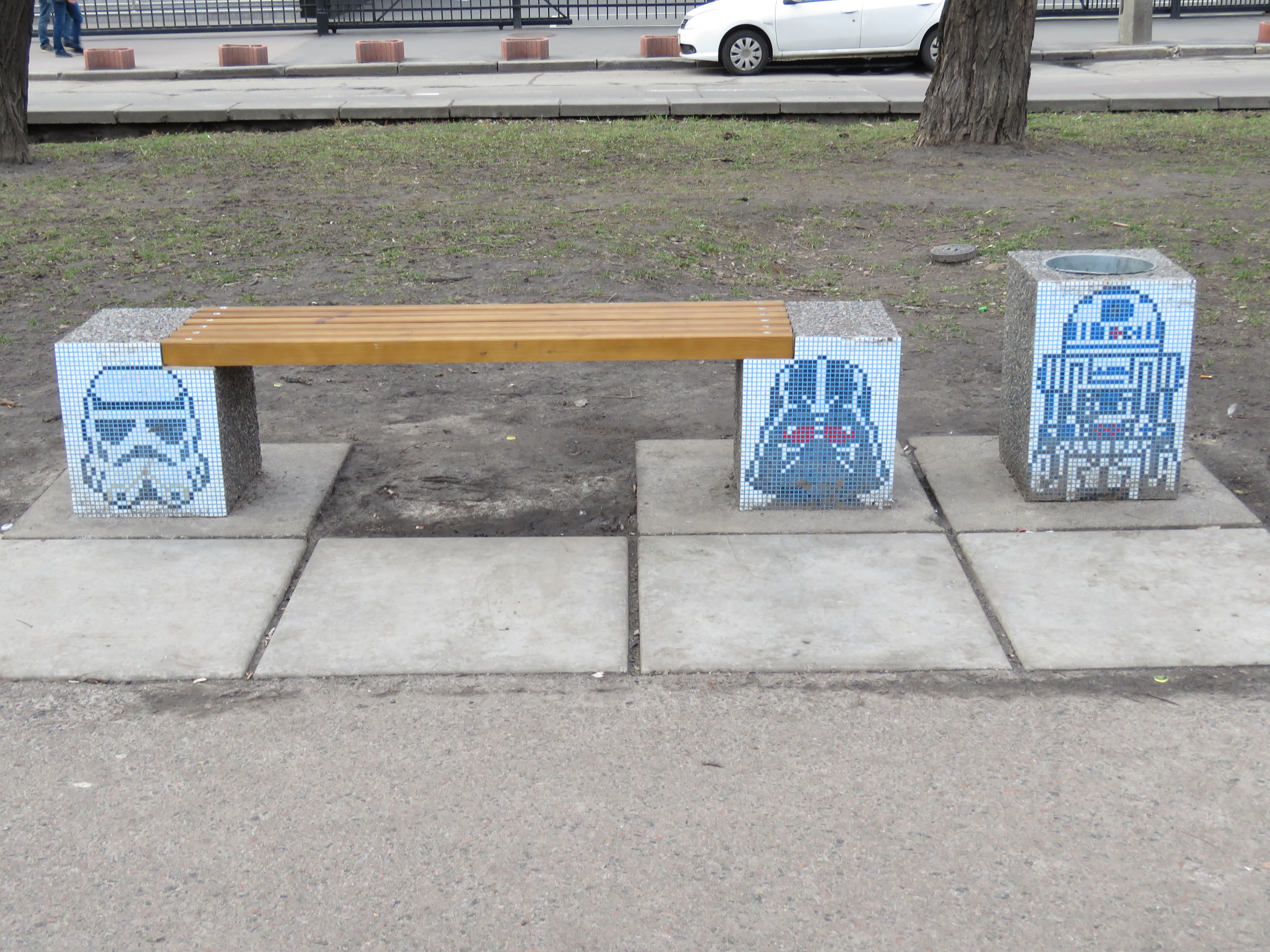 Лавки на Подолі — мої особисті улюбленці. І хоча з них вже щиро позбивали мозаїку, вони все одно прекрасні. Отже, лави та баки (майже архітектурний ансамбль!) для сміття прикрасили культові герої "Зоряних війн", "Футурами" та "Вінні Пуха". Краса!