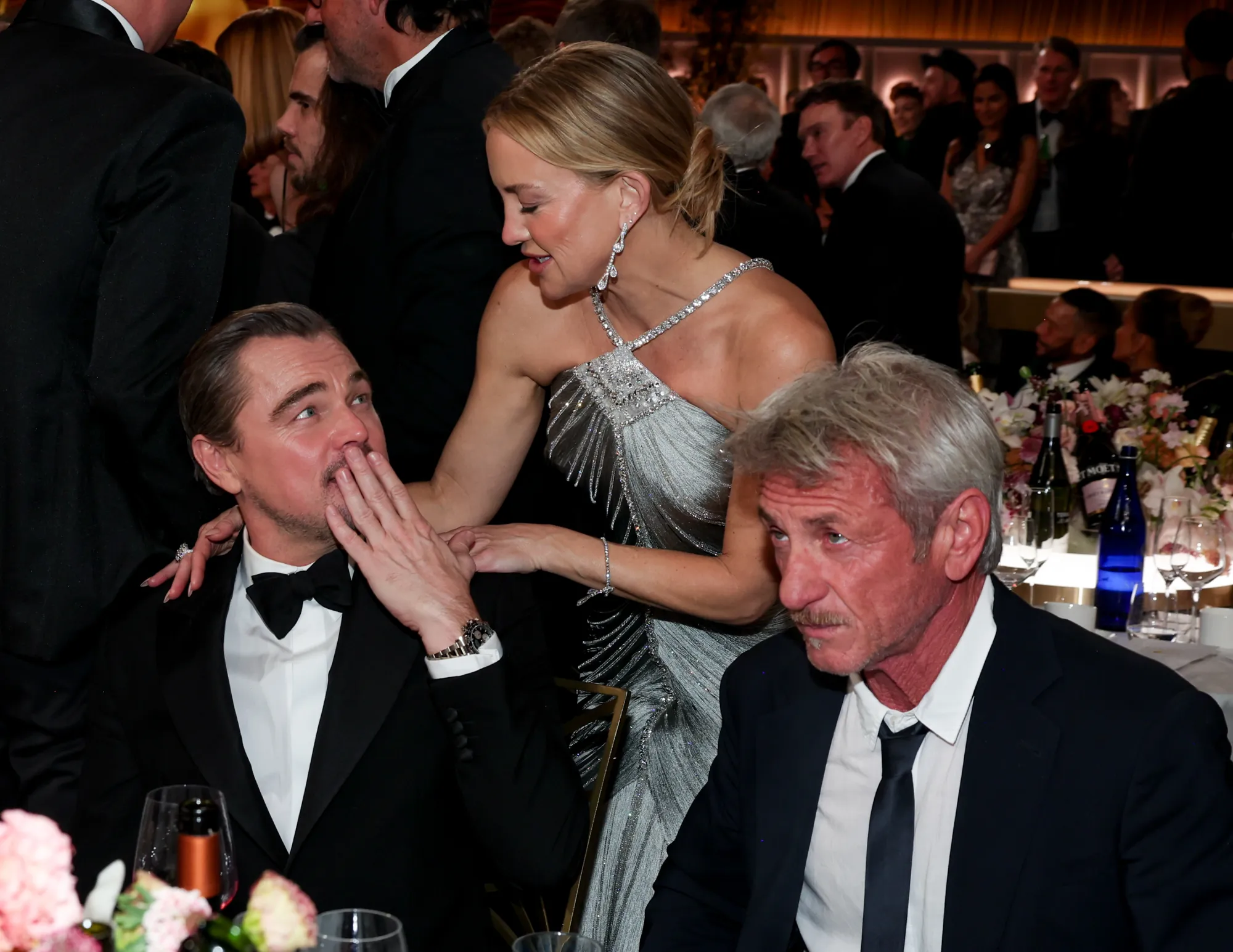 Хоча цей трюк він виробляє вже не вперше. А за столиком він сидів із нею та колегою за фільмом "Одна битва за іншою" Шоном Пенном.