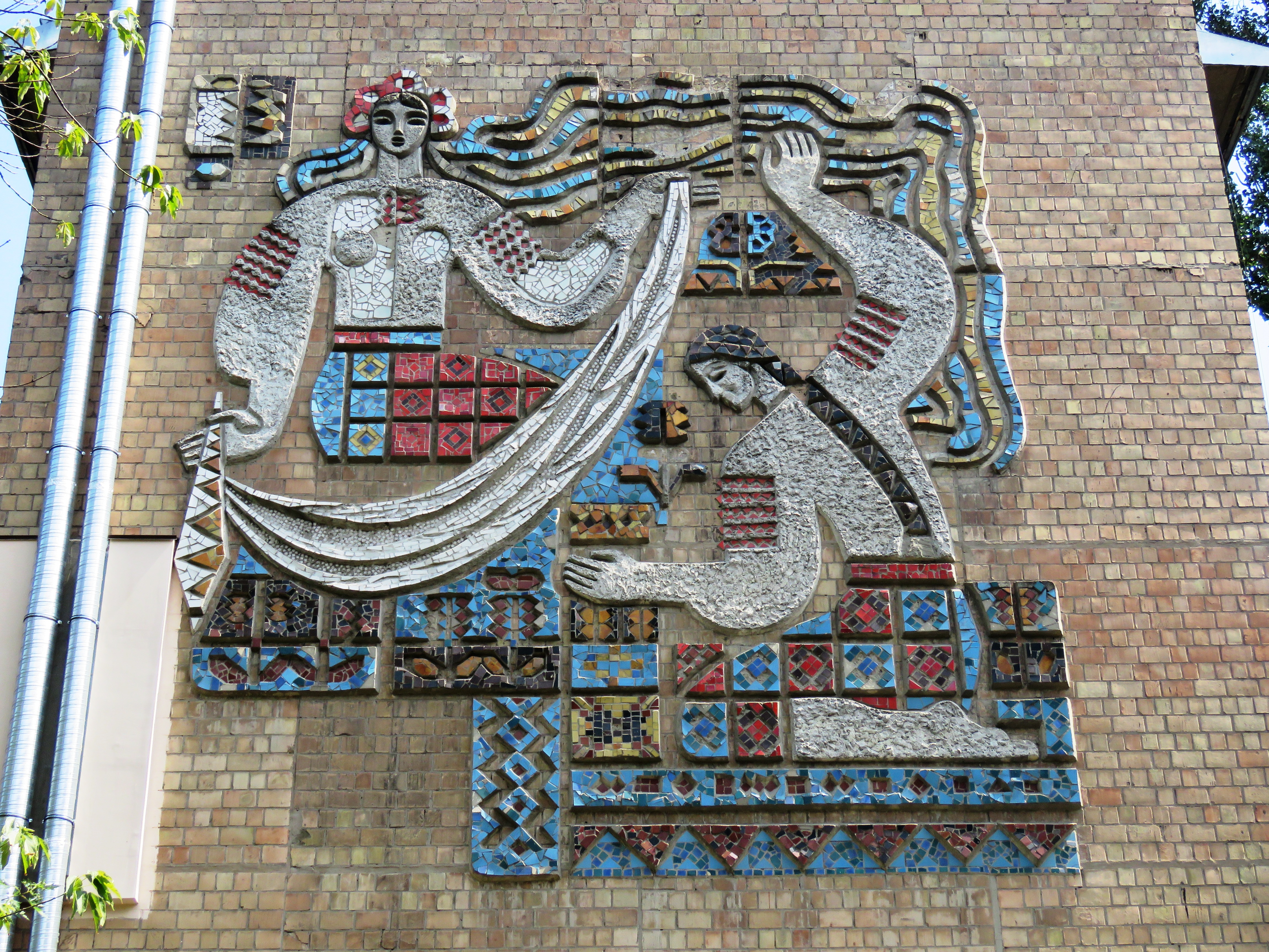 Яскраві, сонячні мозаїки з українськими дівчатами у вишиванках та стилізованими під народні іграшки тваринками — півником, вовчиком та оленем, були створені у 60-х роках художниками Іваном Аполлоновим, Олександром Долотіним та Валерієм Карасем.