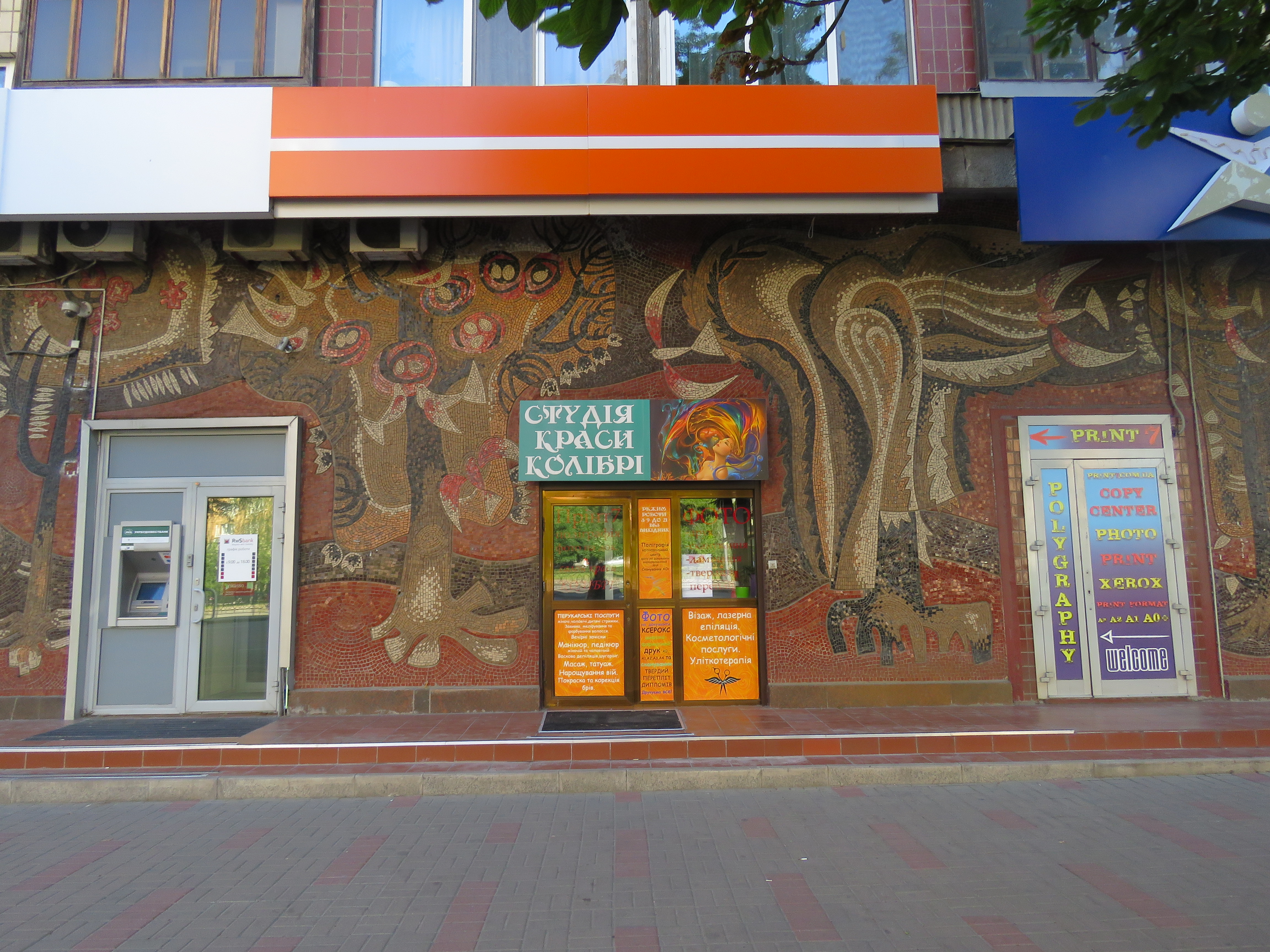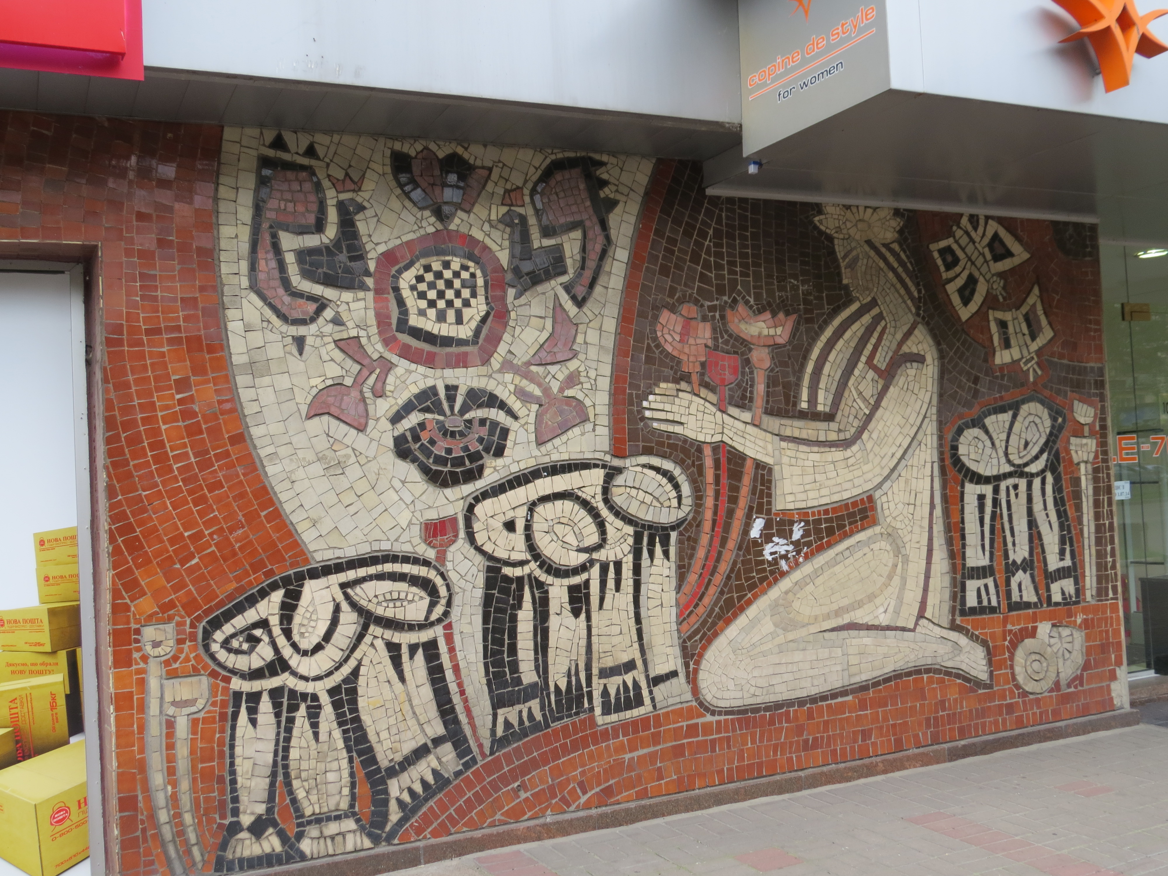 Для чого взагалі роблять красиві мозаїки? Думаєте, щоб хтось ними милувався? Та ні, не будьте такими наївними. Вони потрібні для того, аби пробивати в них додаткові двері. А ще — монтувати прямо на них конструкції літніх верандочок від ресторанів. А що — дуже зручно: сидиш, п'єш апероль та паралельно мистецтво споглядаєш. Принаймні саме так постійно "щастить" неймовірним роботам Анатолія Гайдамаки та Лариси Міщенко, що на бульварі Лесі Українки.
