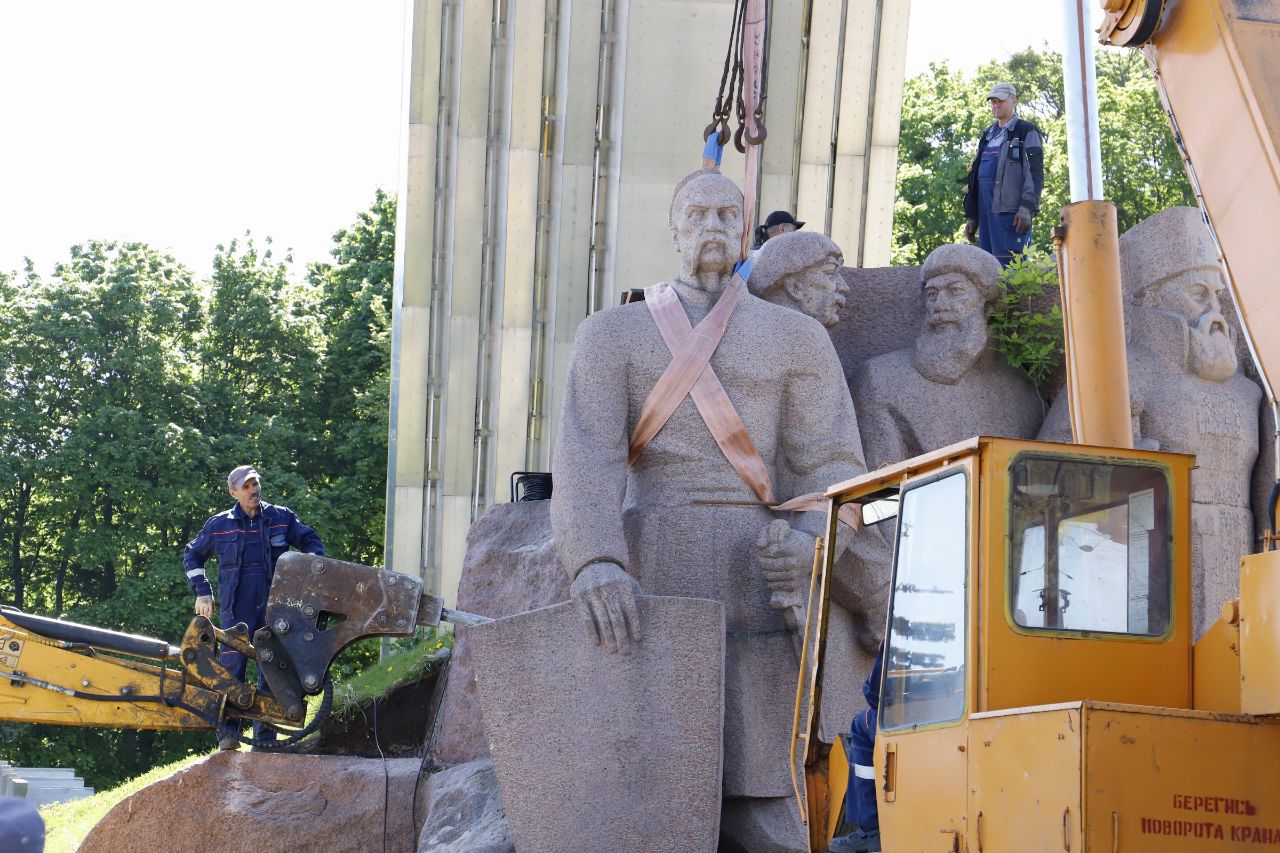У Києві розпочали демонтаж скульптурної композиції на честь Переяславської ради. Роботи проводять у межах заходів з дерусифікації та декомунізації. Про це повідомили в телеграм-каналі КМДА.