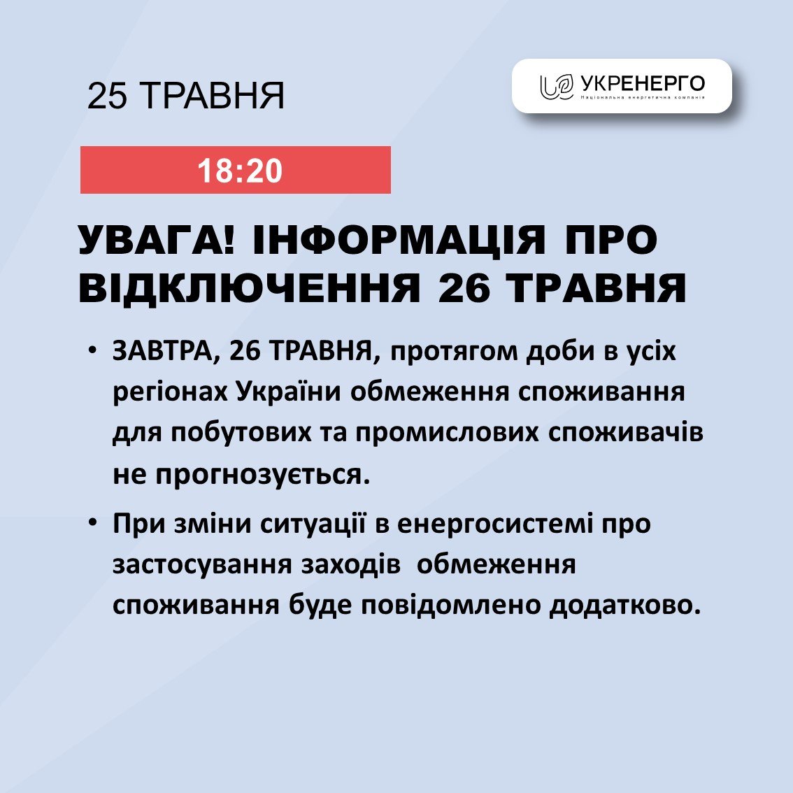 У неділю, 26 травня, відключення електроенергії в Києві та Київській області не прогнозуються. Про це повідомляє Укренерго.