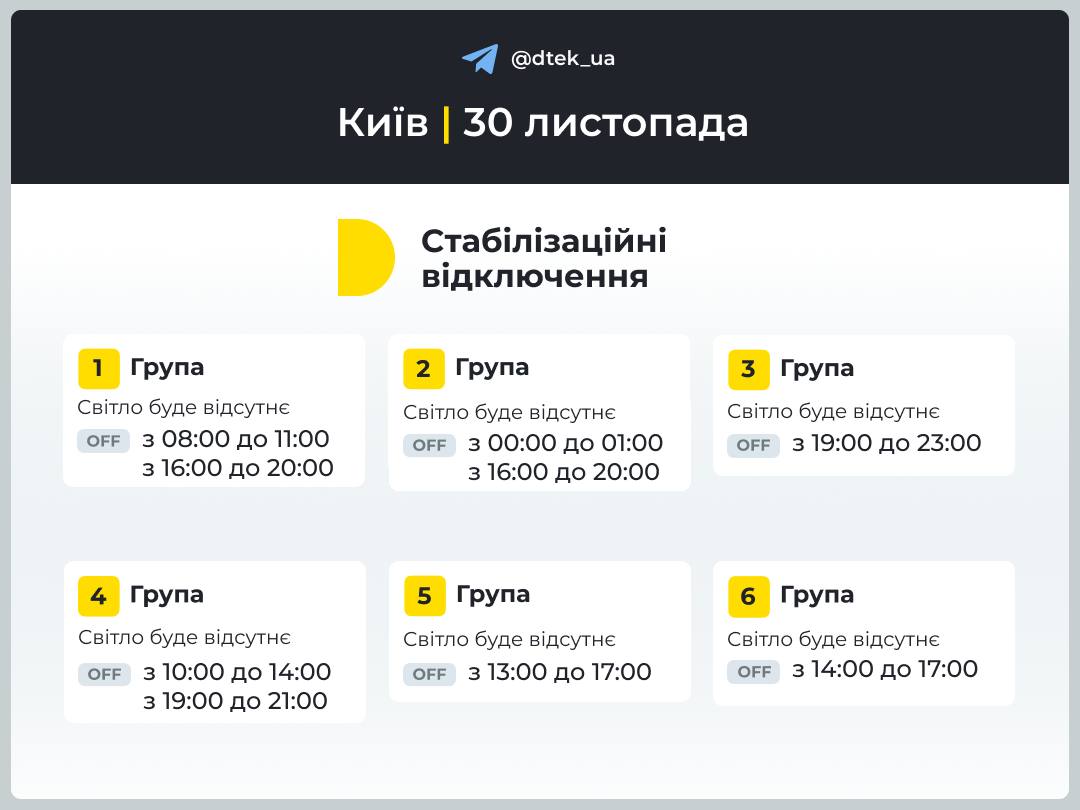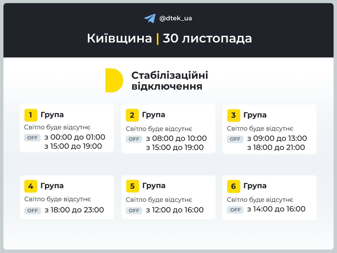 У суботу, 30 листопада, у Києві та Київській області діятимуть пом'якшені графіки стабілізаційних відключень електроенергії. Про це повідомляють Укренерго та ДТЕК.
