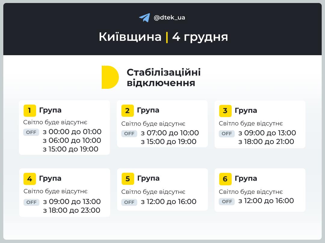 У середу, 4 грудня, графіки стабілізаційних відключень електроенергії у Києві та Київській області діятимуть від самого ранку і до десятої вечора. Про це повідомляють Укренерго та ДТЕК.