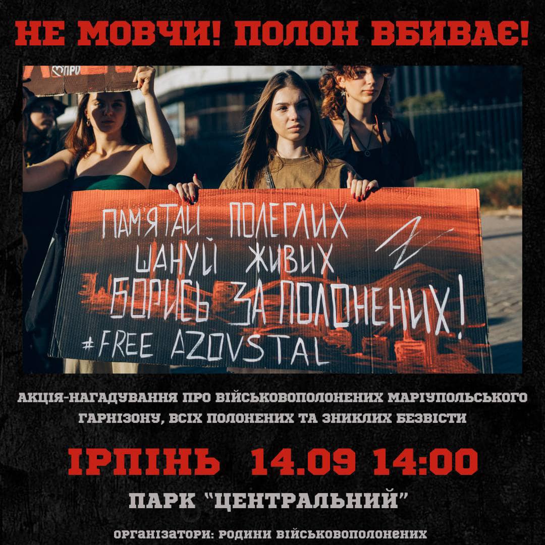 - 14:00 — акція "Не мовчи! Полон вбиває!" на підтримку українських військових, які перебувають у російському полоні;