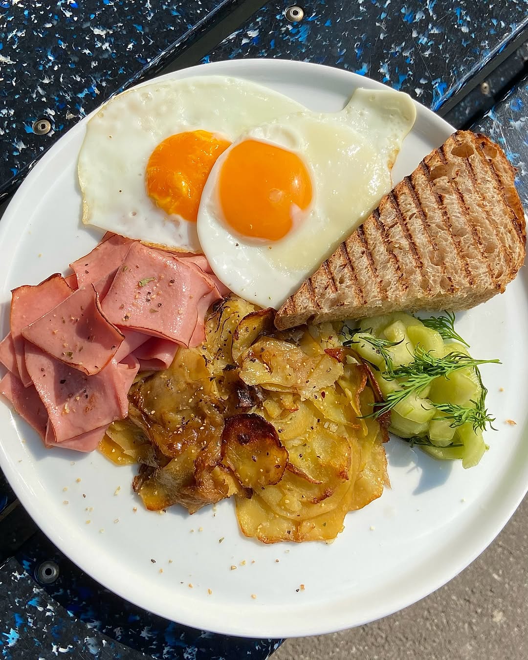 Благодійний "ностальгічний" сніданок включає яєчню, картоплю, малосольні огірки, варену ковбасу та шматок хліба. Еттінгер каже, що ця страва асоціюється у неї з дитинством та сніданками, які готувала мама.