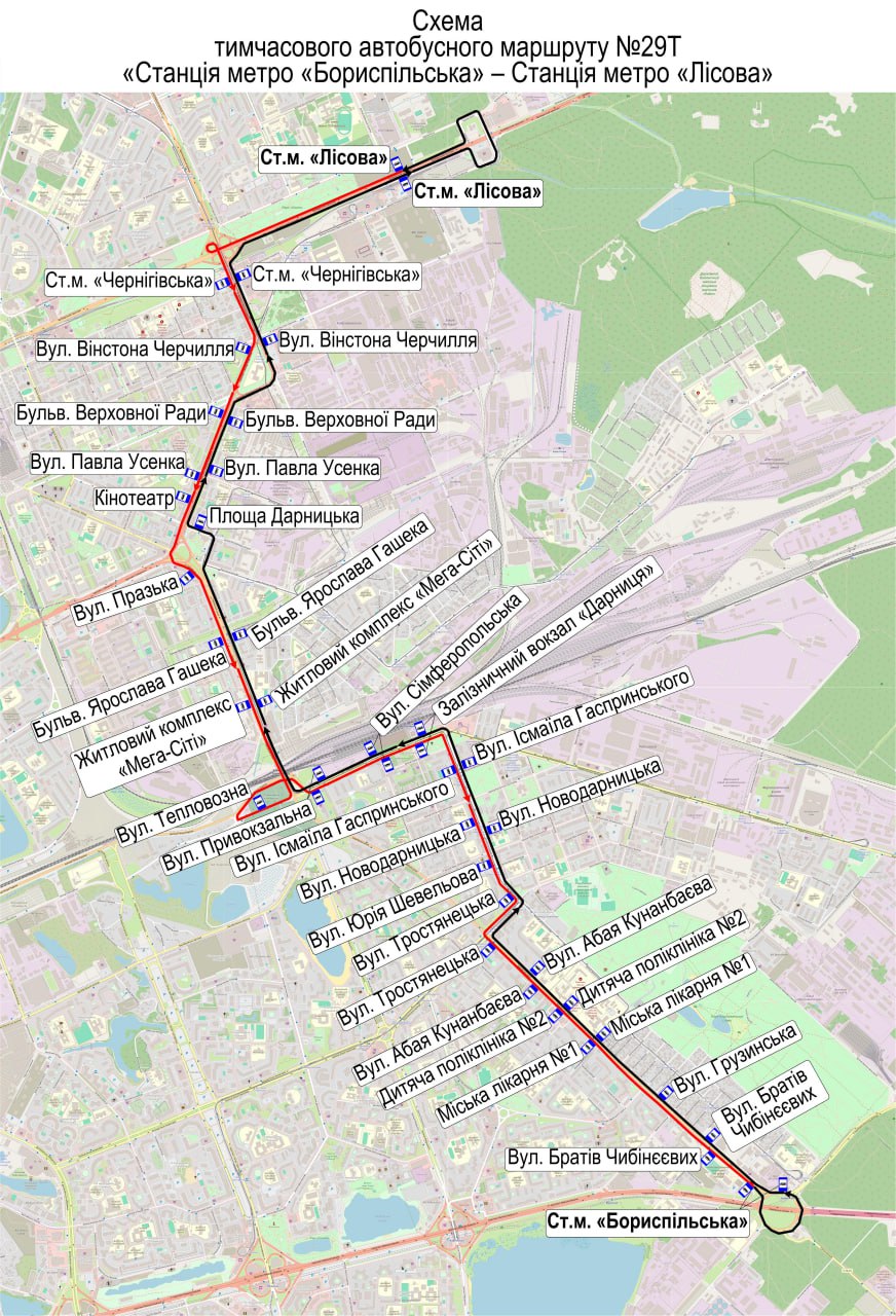 - 29т – ст. м. "Бориспільська" – ст. м. "Лісова".