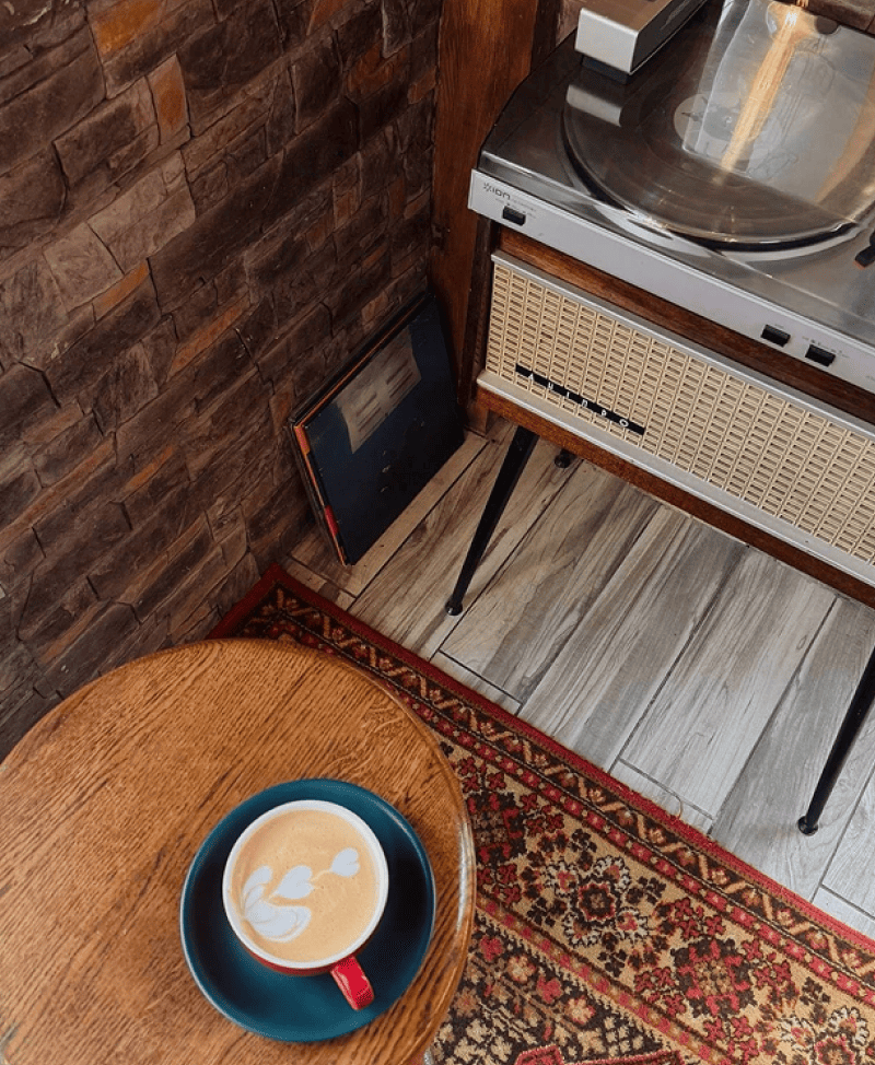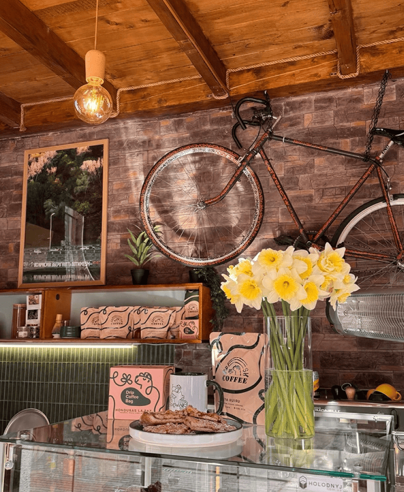 Фішкою інтер'єру став старий велосипед "Турист", розписаний тегами, що висить на стіні. Також там є вініловий програвач і платівки та автентичний килим. Кав'ярня має літній майданчик зі столиками та зелені клумби з подушками.