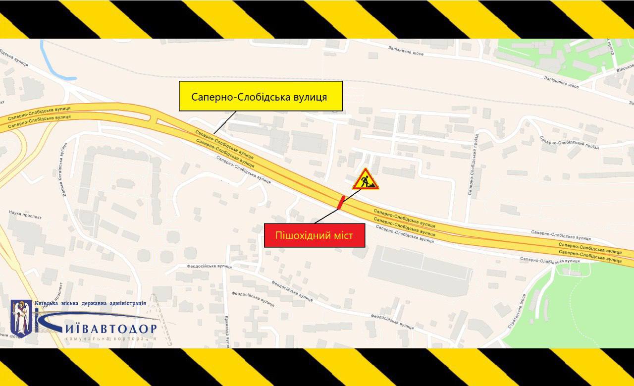 З вівторка, 15 жовтня, на пішохідному мосту на вулиці Саперно-Слобідській повністю обмежать рух. Про це повідомляє пресслужба КМДА.