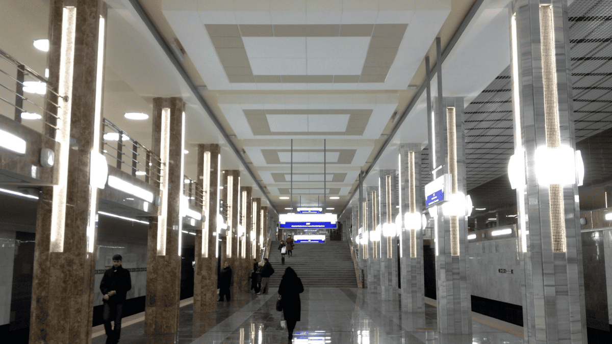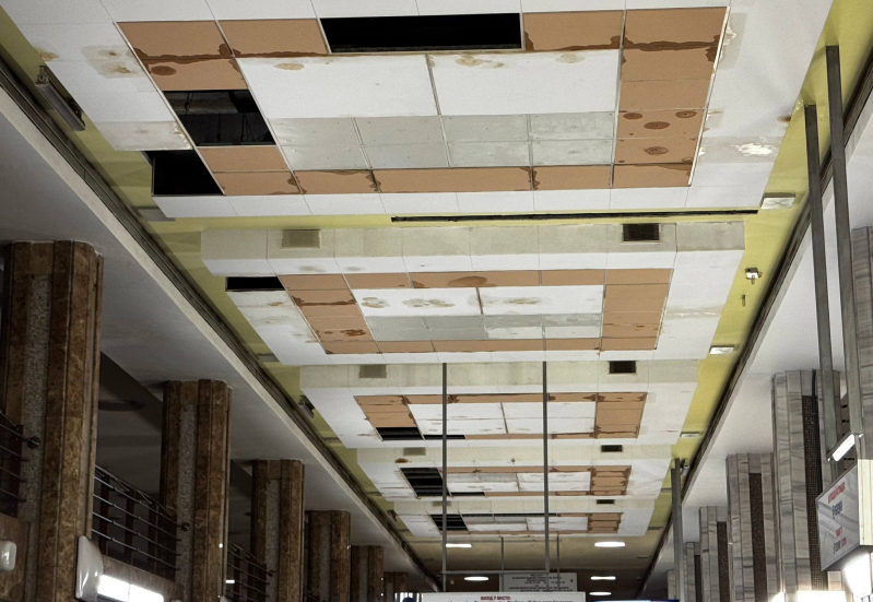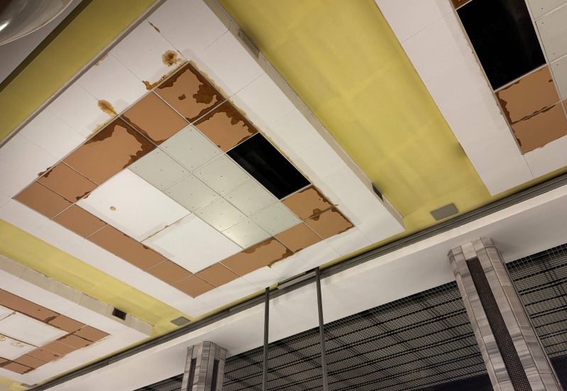 На фото видно, що на підвісній стелі подекуди відсутні окремі елементи, а також відбувається їх набухання від вологи, що може свідчити про проблеми з гідроізоляцією станції.