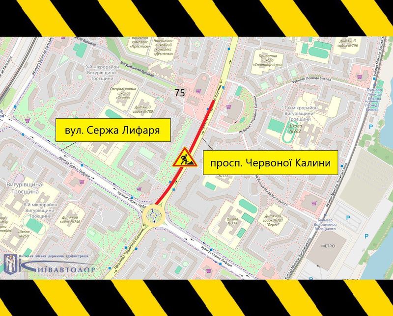 Крім того, 21 та 22 травня частково обмежать рух проспектом Червоної Калини на Троєщині. Там влаштовуватимуть верхній шар асфальтобетонного покриття на ділянці від будинку №75 до транспортної розв'язки з вулицею Сержа Лифаря.