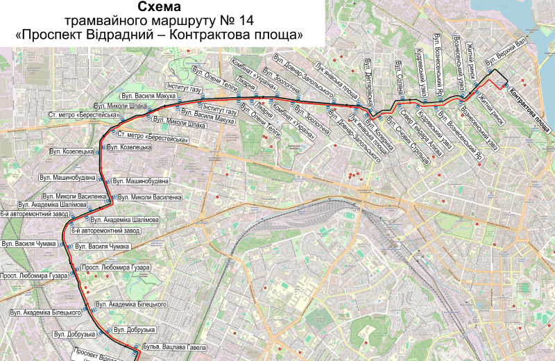 Натомість сьогодні зупинили тимчасовий автобусний маршрут № 14-Т "Просп. Відрадний — Контрактова площа", який діяв під час ремонтних робіт.