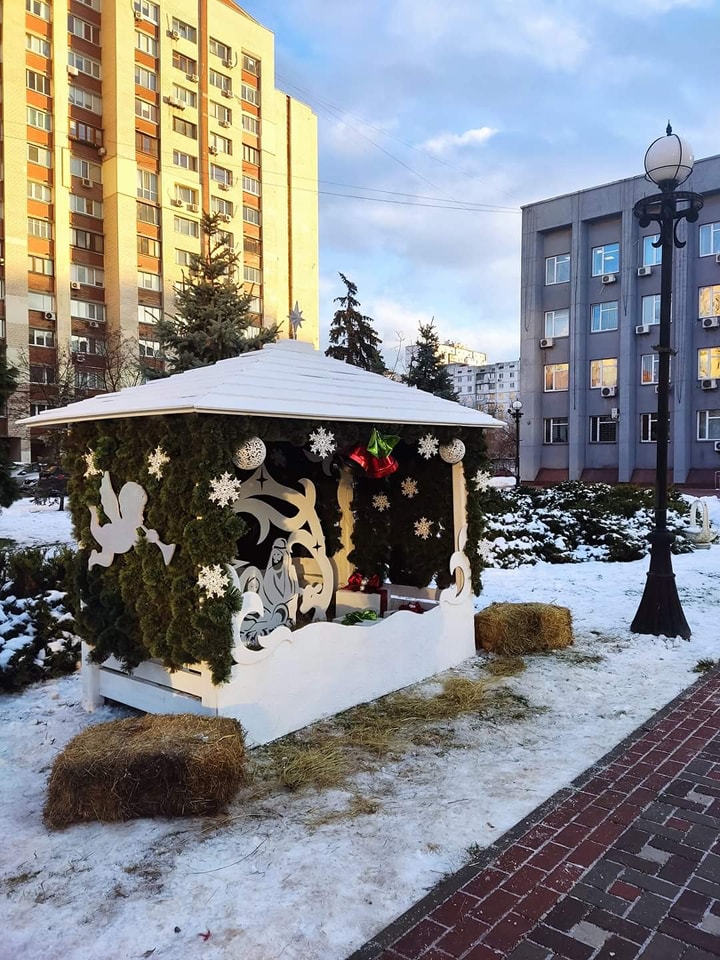 А на Оболоні вже прикрасили головну ялинку району. Це живе дерево на площі біля РДА. Також поруч встановили різдвяний вертеп.