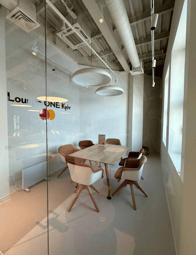 А для ділових зустрічей облаштували окрему переговорну кімнату. Лаунж пет-френдлі, тому там будуть раді людям з домашніми улюбленцями.
