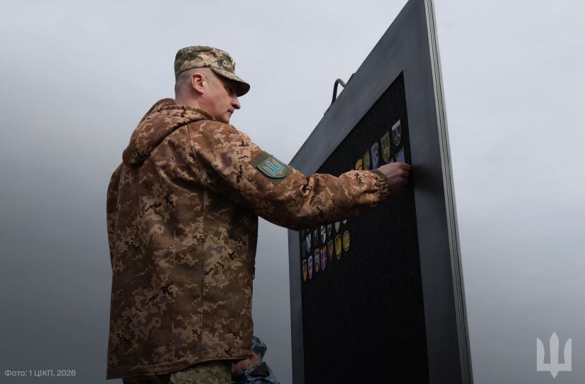 На плиті намальовані червоні стрілки з плану російського вторгнення, а між двома частинами встановлена сталева стела з шевронами всіх підрозділів, що брали участь у звільненні Київської області.