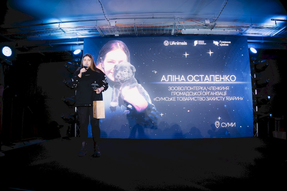 - Аліна Остапенко, зооволонтерка, членкиня ГО "Сумське товариство захисту тварин". Вона займається зоозахистом понад 10 років, а від початку повномасштабної війни разом з командою волонтерів рятує залишених тварин у прикордонних громадах Сумщини. Також курує програми стерилізації та адопції за кордон і безліч інших проєктів.