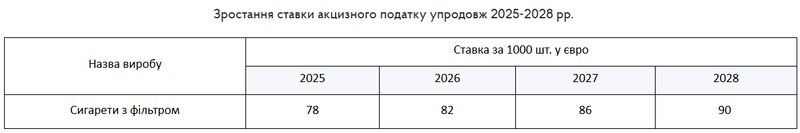 Документ передбачає підвищення акцизу на тютюнові вироби з 1 січня 2025 року і далі — щорічно до 2028 року. Так, ставка акцизу на сигарети з фільтром наступного року зросте до 78 євро за тисячу штук. Відповідно, суттєво підвищиться і їхня вартість.