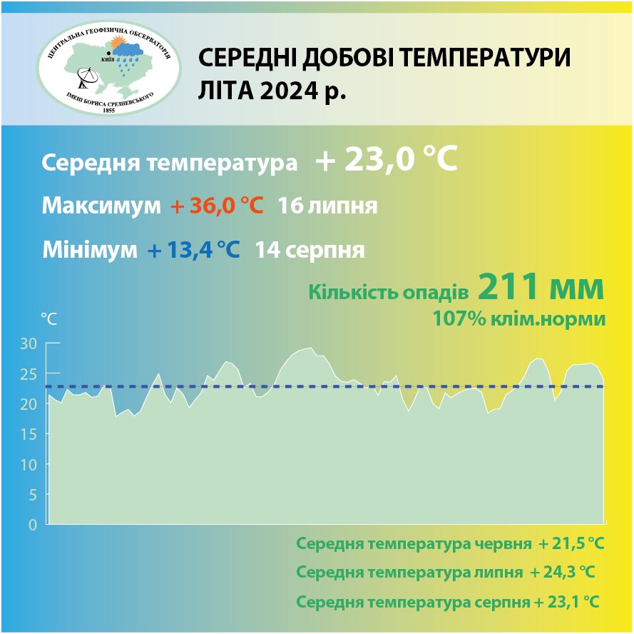 Середня літня температура повітря в Києві становила +23 градуси, що на 2,6 градуса перевищило кліматичну норму.