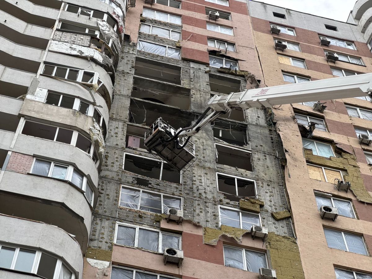 Напередодні рятувальники зачистили фасади від аварійних конструкцій. Сьогодні планують завершити закриття пошкоджених вікон і перейти до повного відновлення житла.