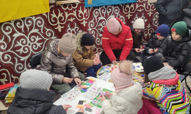 В таких пунктах незламності є генератор, Starlink, зарядні станції, пригощають гарячим казахським чаєм та свіжими баурсаками на вогні (казахський хліб). Також облаштована дитяча зона зі столиками, стільцями, є розмальовки та олівці.