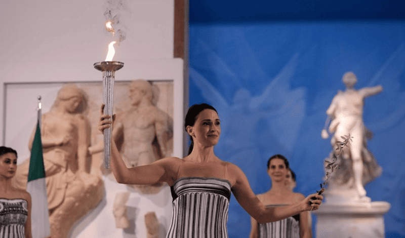 Церемонія мала пройти на відкритому античному стадіоні, однак через похмуру погоду її провели в Археологічному музеї. За традицією біля храму Гери акторки в образах жриць запалили полум'я за допомогою параболічного дзеркала від променів Сонця. Саме на цьому місці майже 3000 років тому й зародилися Ігри.