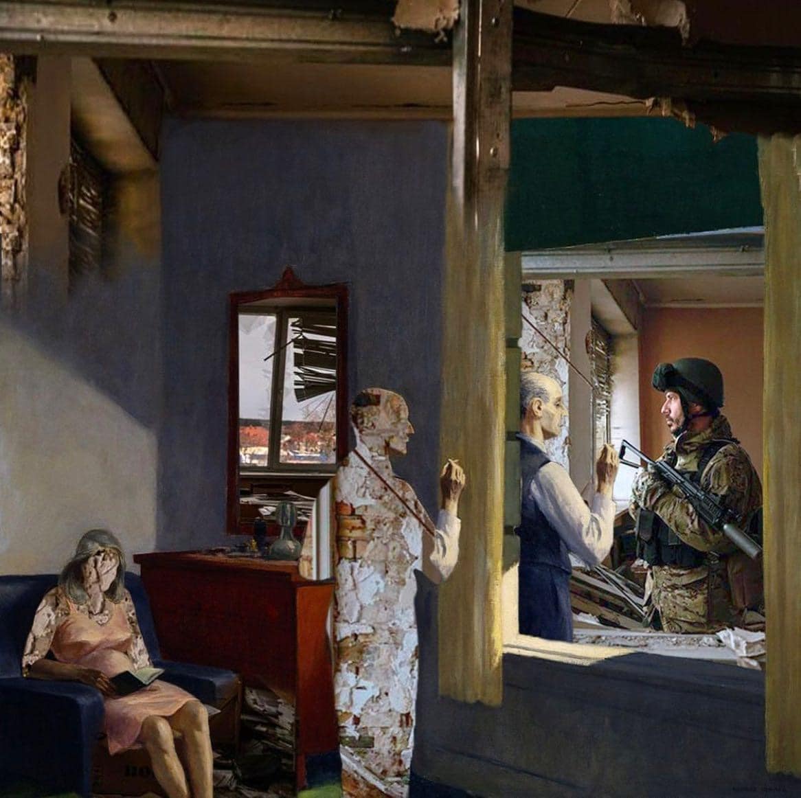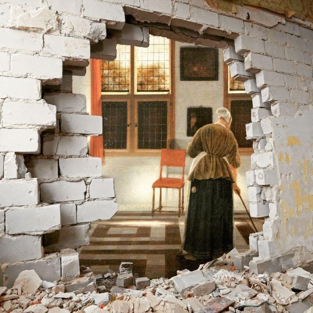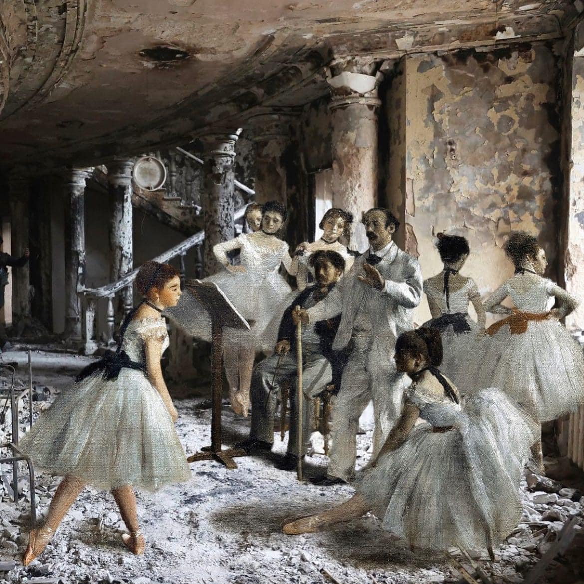 Виставка стане візуальним діалогом між минулим і сучасним, між класичним європейським живописом і реаліями війни в Україні. Фанні Лешевальє працює в техніці фотомонтажу, накладаючи знімки воєнних кореспондентів на репродукції класичних творів європейського живопису. Так вона вписує реалії війни у міфологічні та історичні сюжети.