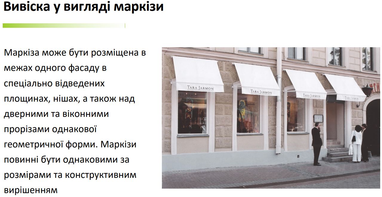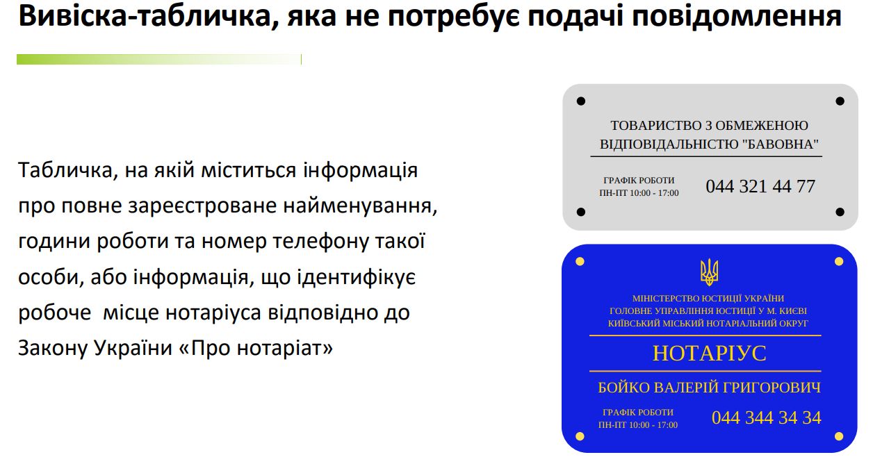 - Додали нові типи вивісок: маркіза та інформаційна табличка. Другий тип, інформаційна табличка, не потребує подачі повідомлення про розміщення. На ній має бути повна назва юридичної особи та графік роботи.