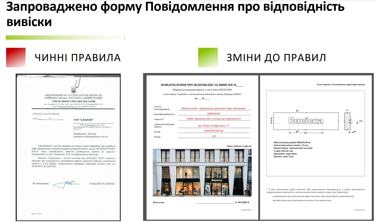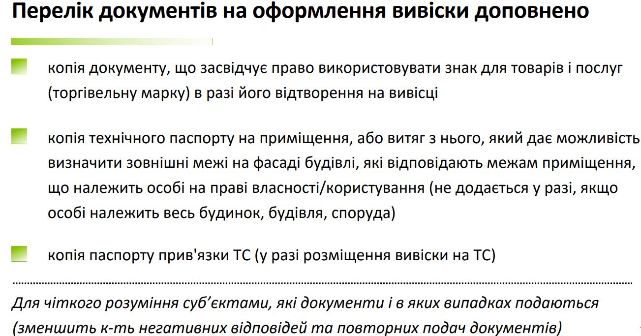 - Запровадили зміни у процедурі оформлення вивісок. Зокрема, доповнили перелік необхідних документів.