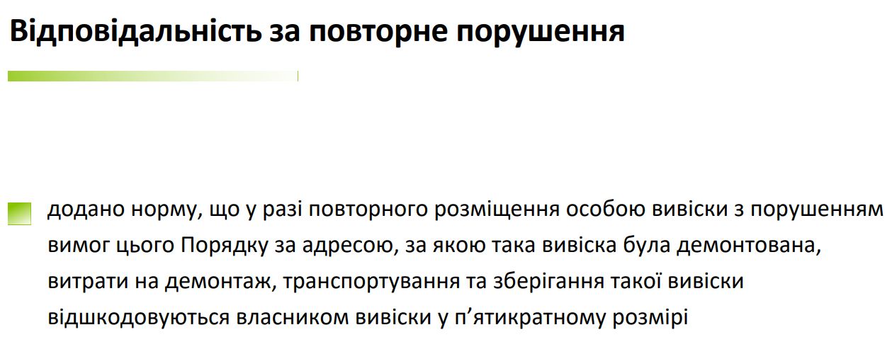 - У п'ять разів підвищили штрафи за повторне самовільне розміщення вивіски.