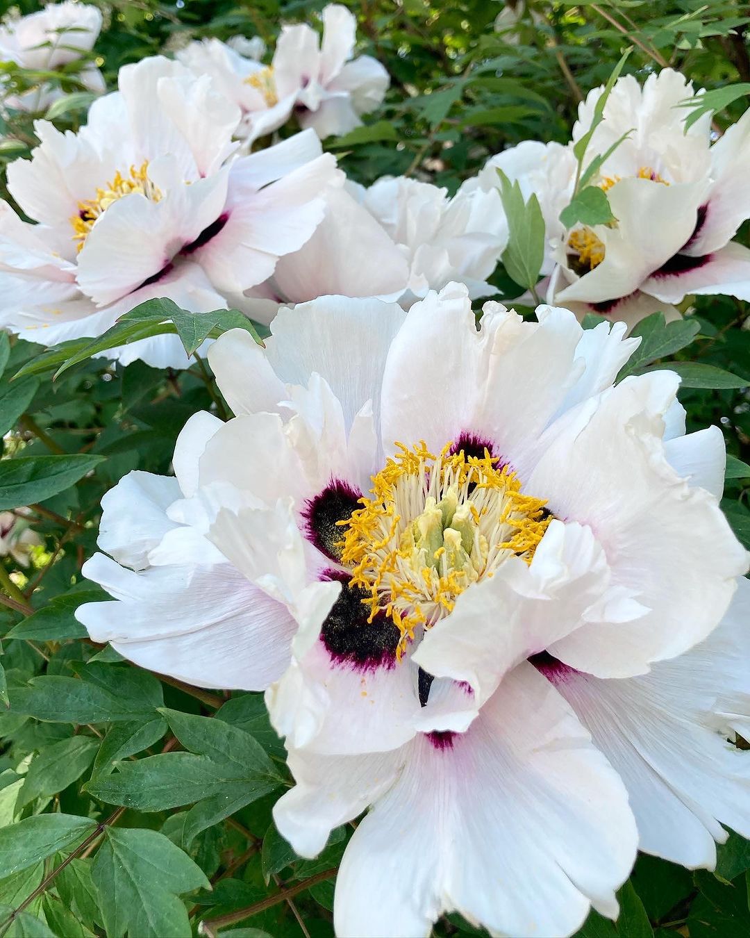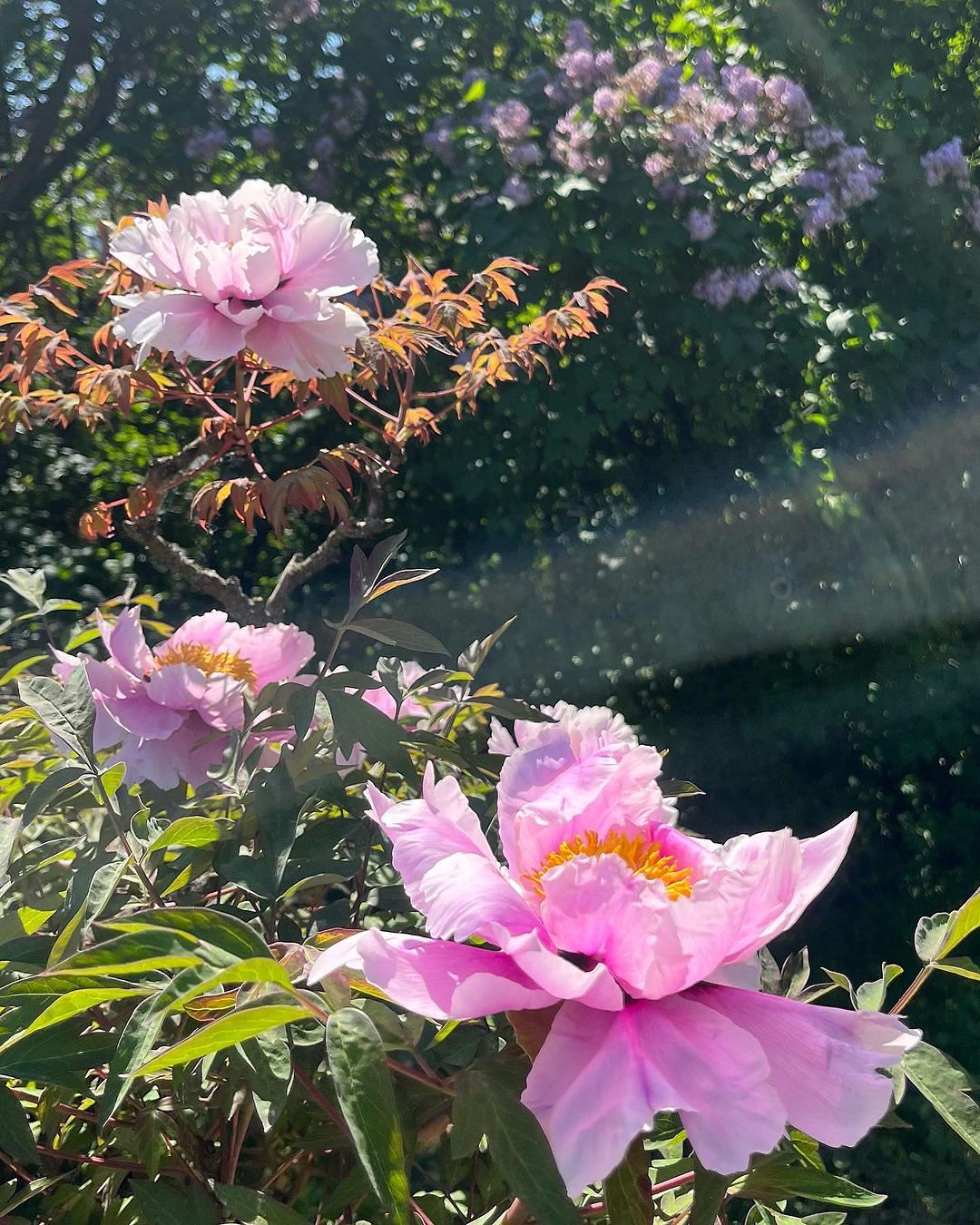 Бузок і півонії квітнуть поряд, ці ділянки називаються монокультурними садами. Одночасне цвітіння рослин дає можливість підсилити враження відвідувачів та заповнити сад яскравими барвами й ароматом.