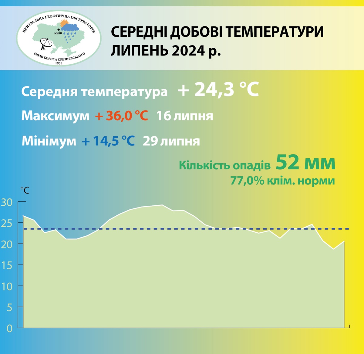 Найхолодніше було 29 липня, коли мінімальна температура знизилась під ранок до 14,5 градусів. Найспекотніше було 16 липня, коли температура повітря піднялася до +36 градусів і встановила температурний рекорд.