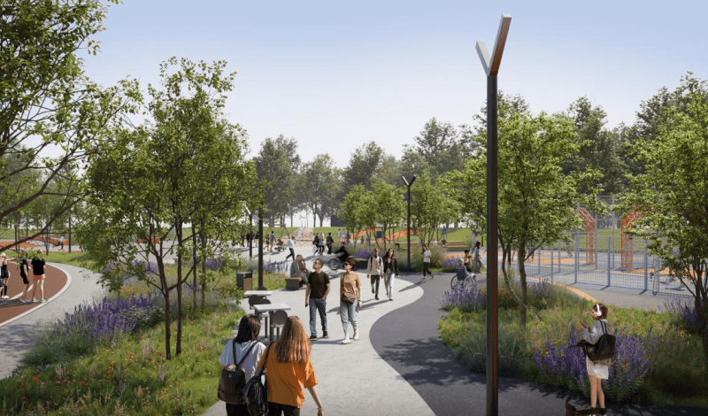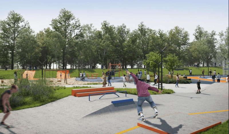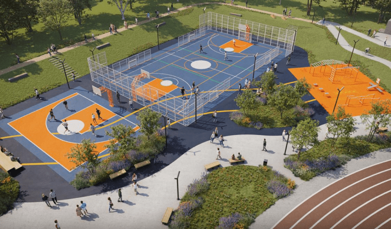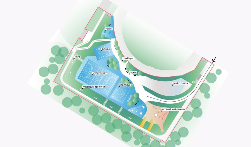 Там облаштують мультикорт для волейболу, бадмінтону, стрит-футболу та баскетболу, бетонний парк для скейтборду, BMX, самокатів і роликів, майданчики для воркауту, стритболу й настільного тенісу. Водночас передбачено простір для йоги, дитячий майданчик, зону тихих ігор зі стаціонарними шаховими дошками та стежки з місцями для відпочинку, а також зелені схили з трибунами.