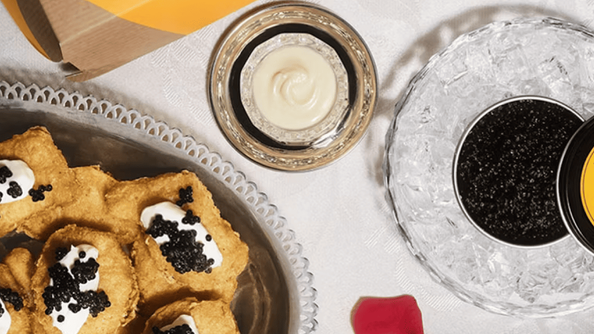 До наборів входять одна унція ікри (близько 30 грамів), перламутрова ложка для ікри, крем-фреш та подарункова картка на 25 доларів для купівлі нагетсів.