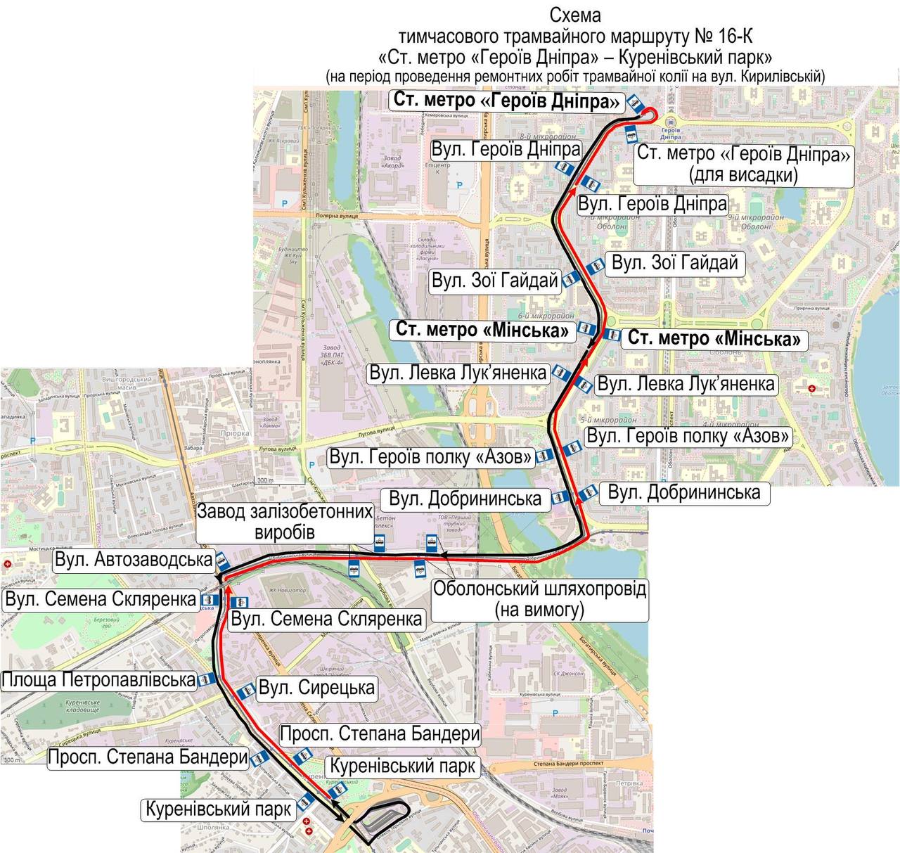 З 28 листопада буде відновлено роботу тимчасового трамвайного маршруту № 16-К "Станція метро "Героїв Дніпра" – Куренівський парк" і тимчасового автобусного маршруту № 11-ТК "Вулиця Сирецька – Контрактова площа". Про це повідомляє пресслужба КМДА.