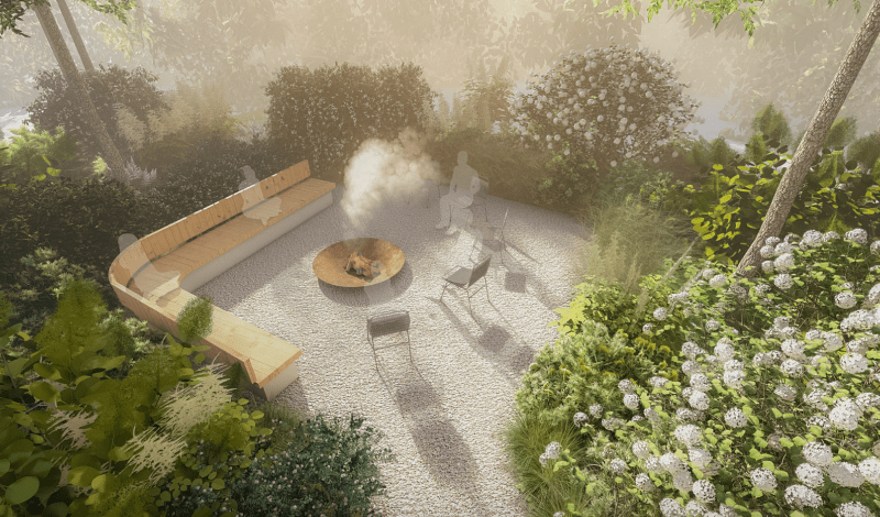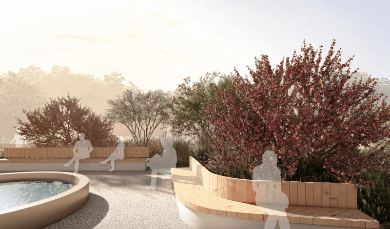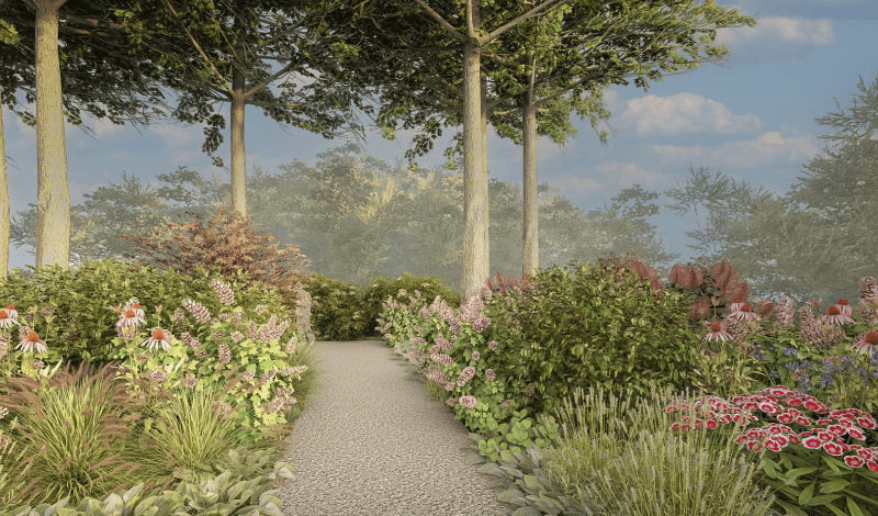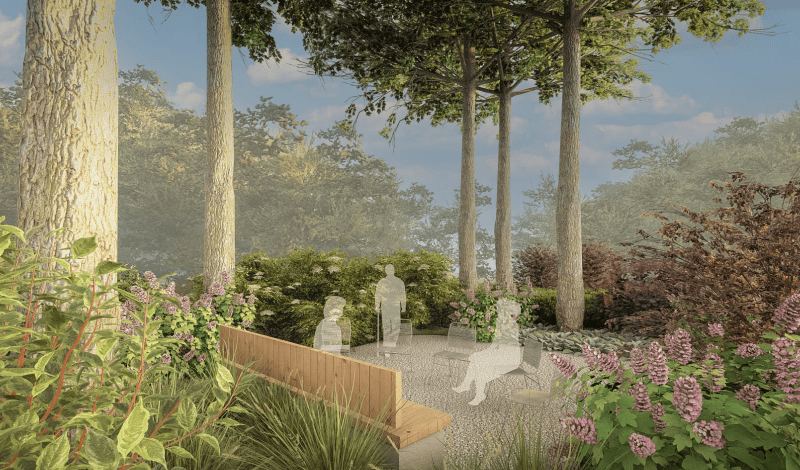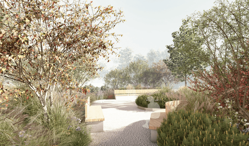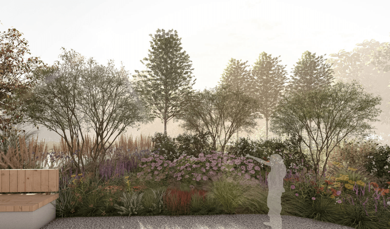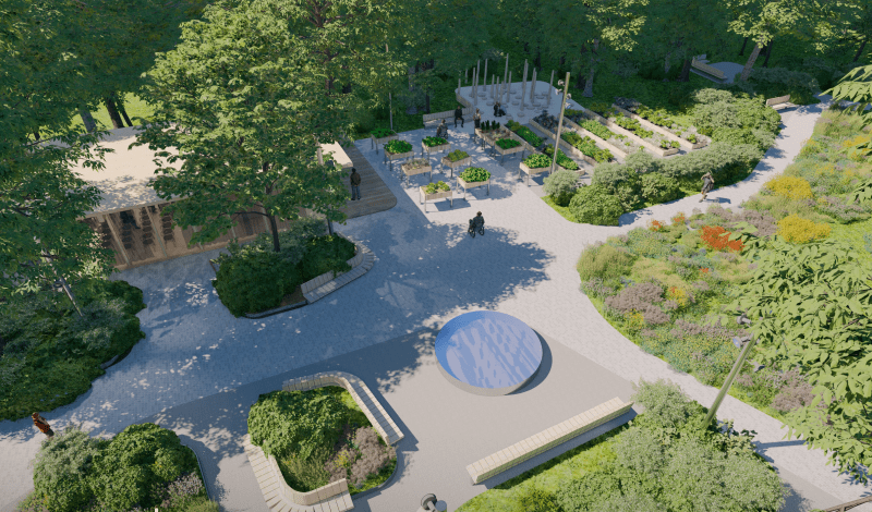 На вході до Саду висадять дерева й кущі, що формуватимуть яскраві сезонні акценти: восени це клен, горобина та ірга Ламарка, а навесні — бузок. У центральній частині будуть сонячні луки багаторічників, а щільні кущі висадять довкола зон проведення терапевтичних практик, що створюватиме атмосферу затишку та безпеки.